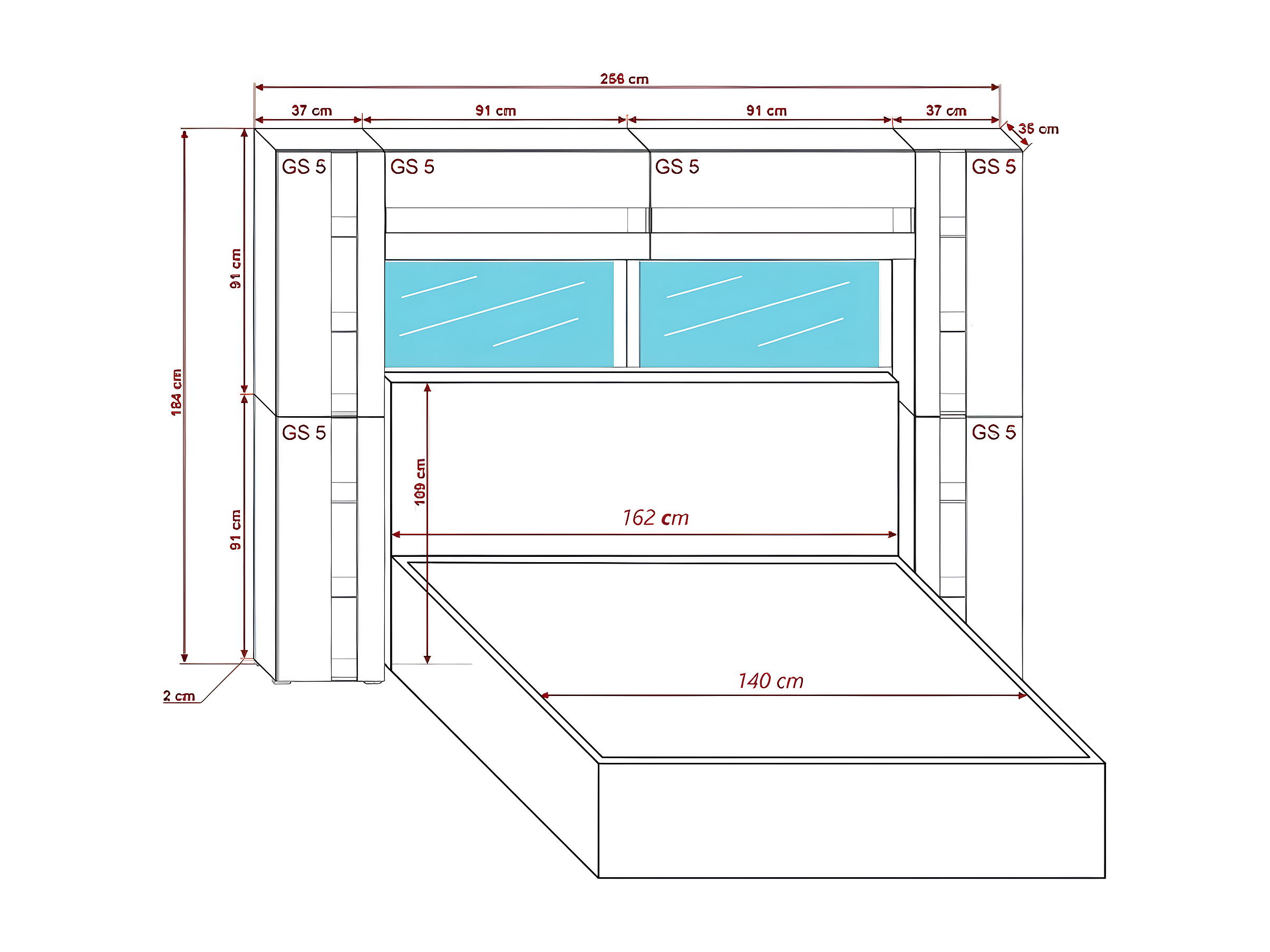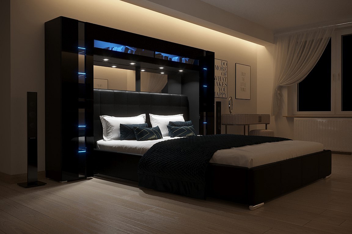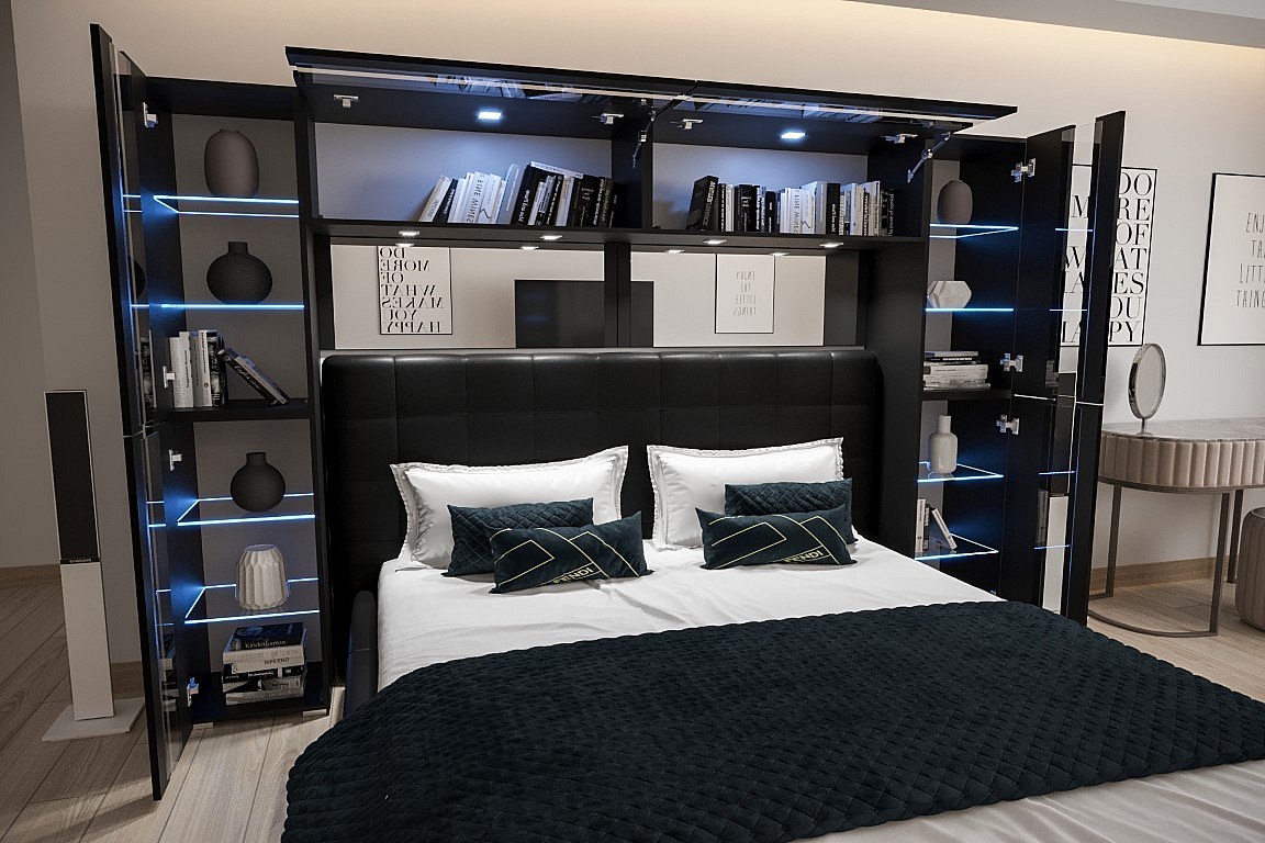 Tête de lit avec rangement Armoire - pont de lit PANAMA 14-HG-B-1-1A noir/noir brillant 256x184x35cm