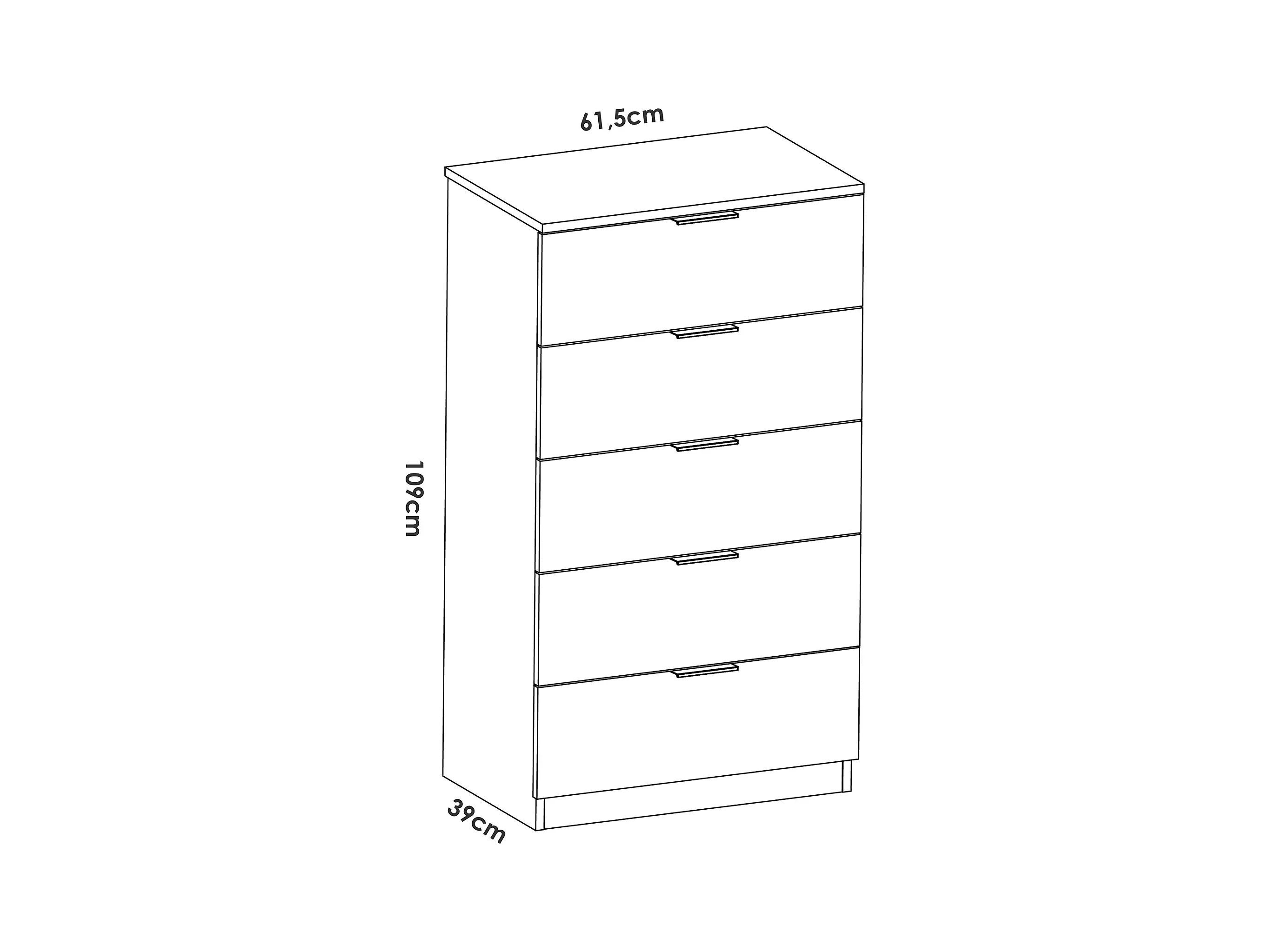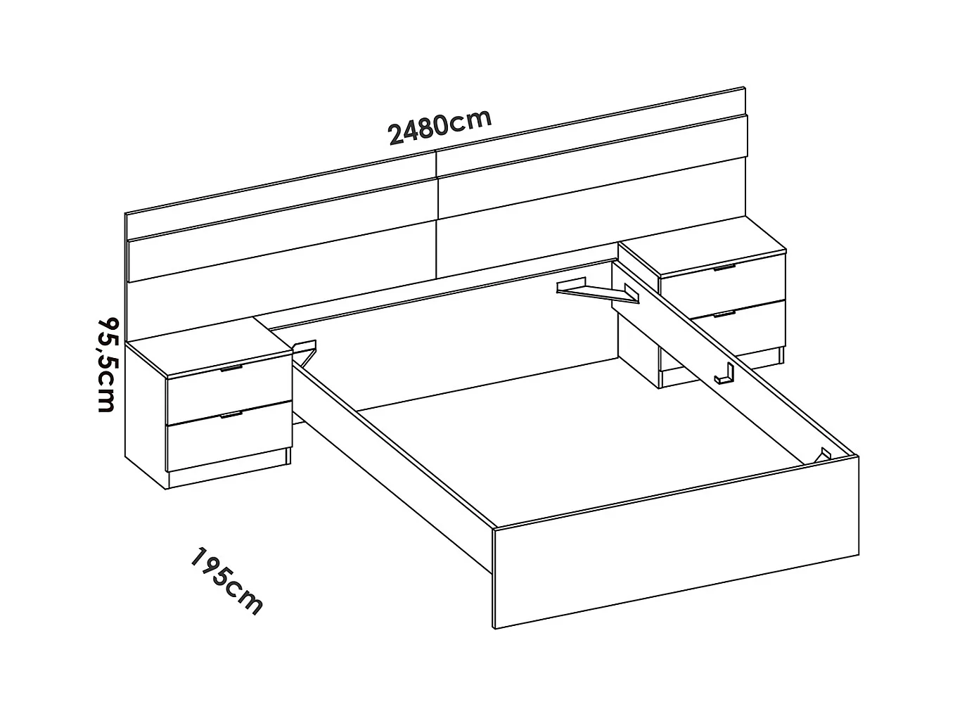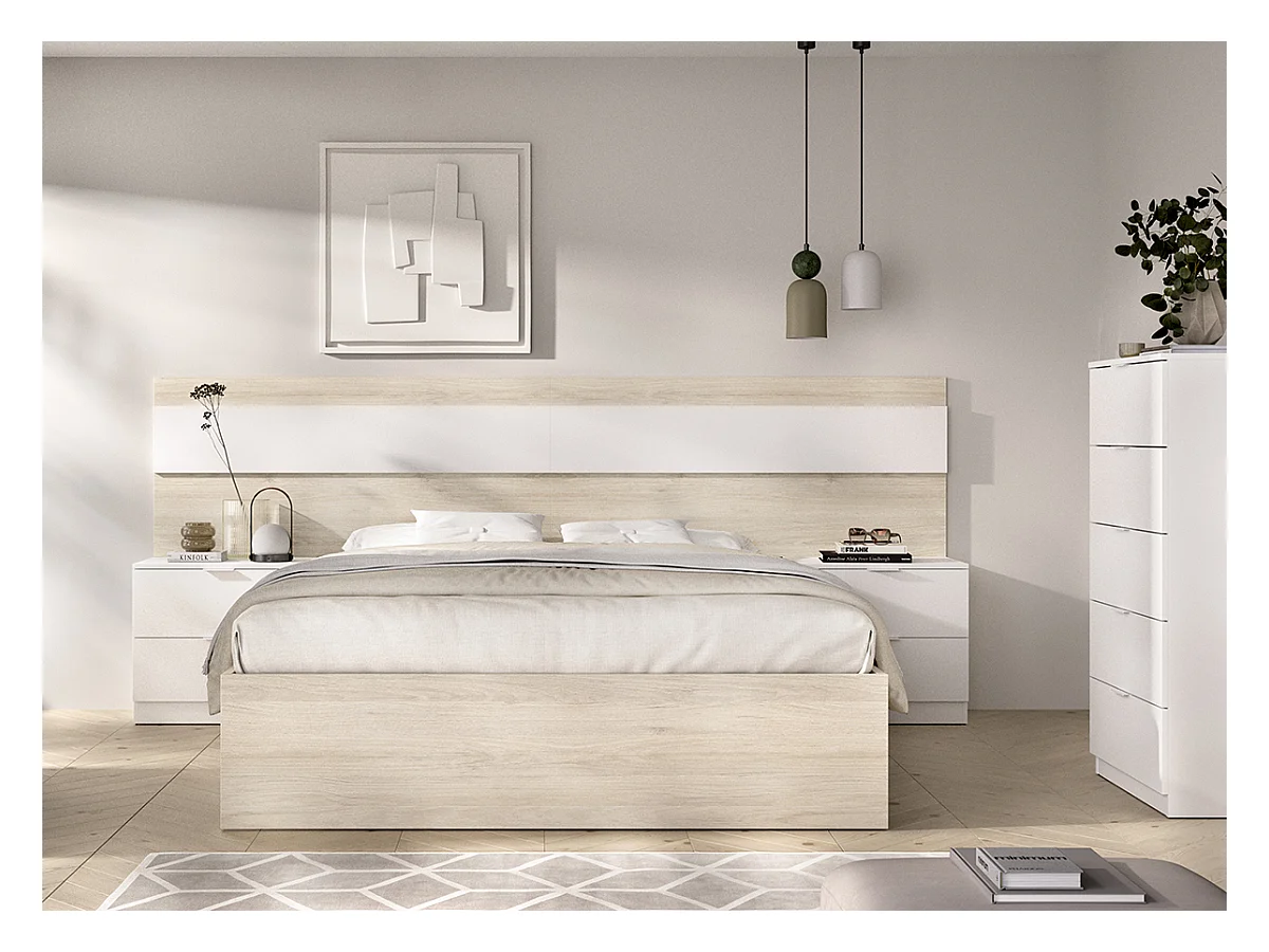 Tête de lit avec 2 tables de chevet , Structure de lit 140x190 cm et commode avec 5 tiroirs coloris chêne naturel, blanc