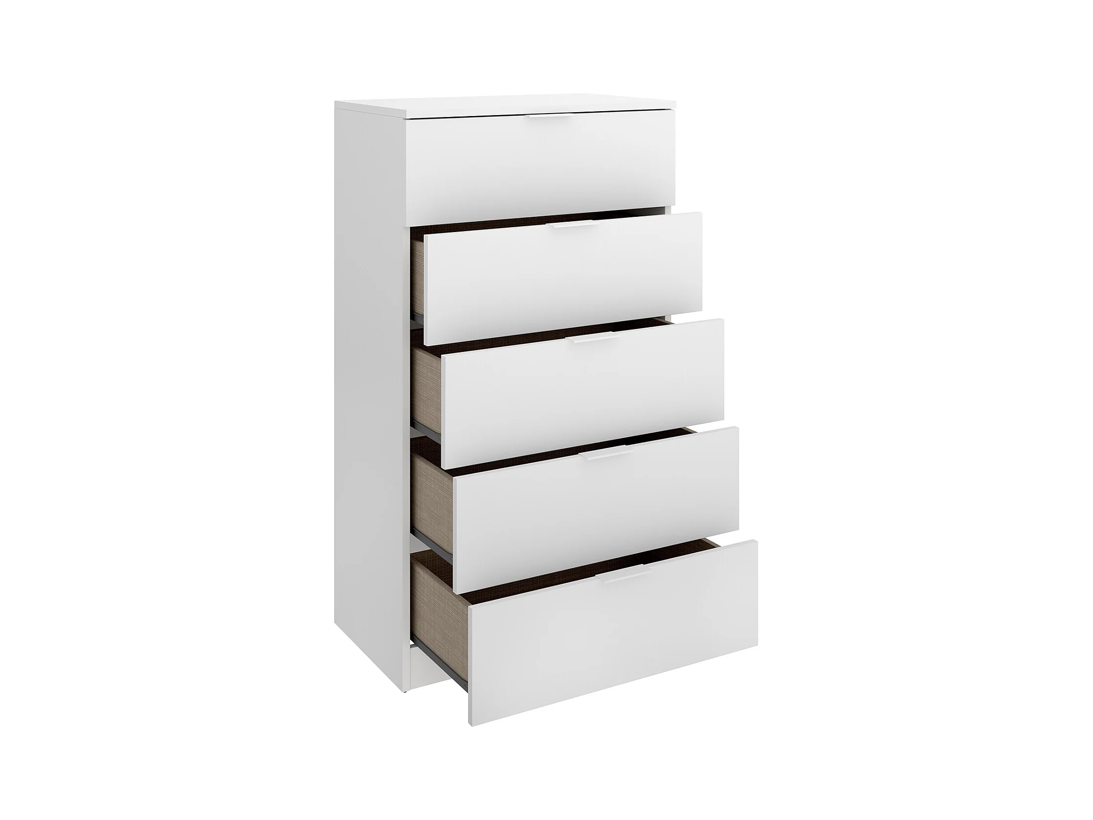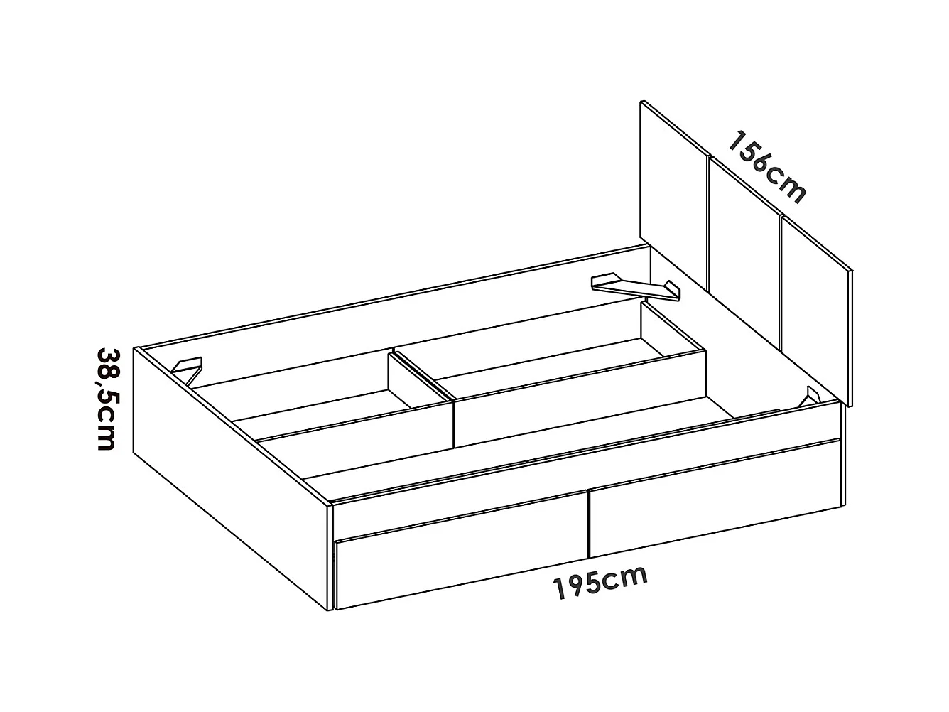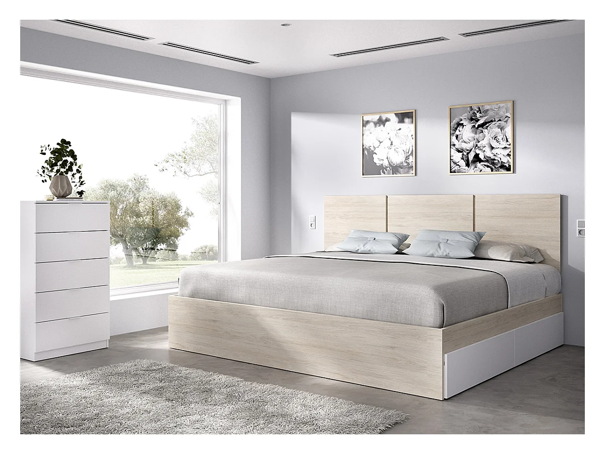 Tête de lit avec structure de lit 140X190cm + 4 tiroirs + commode haute 5 tiroirs coloris blanc, chêne naturel