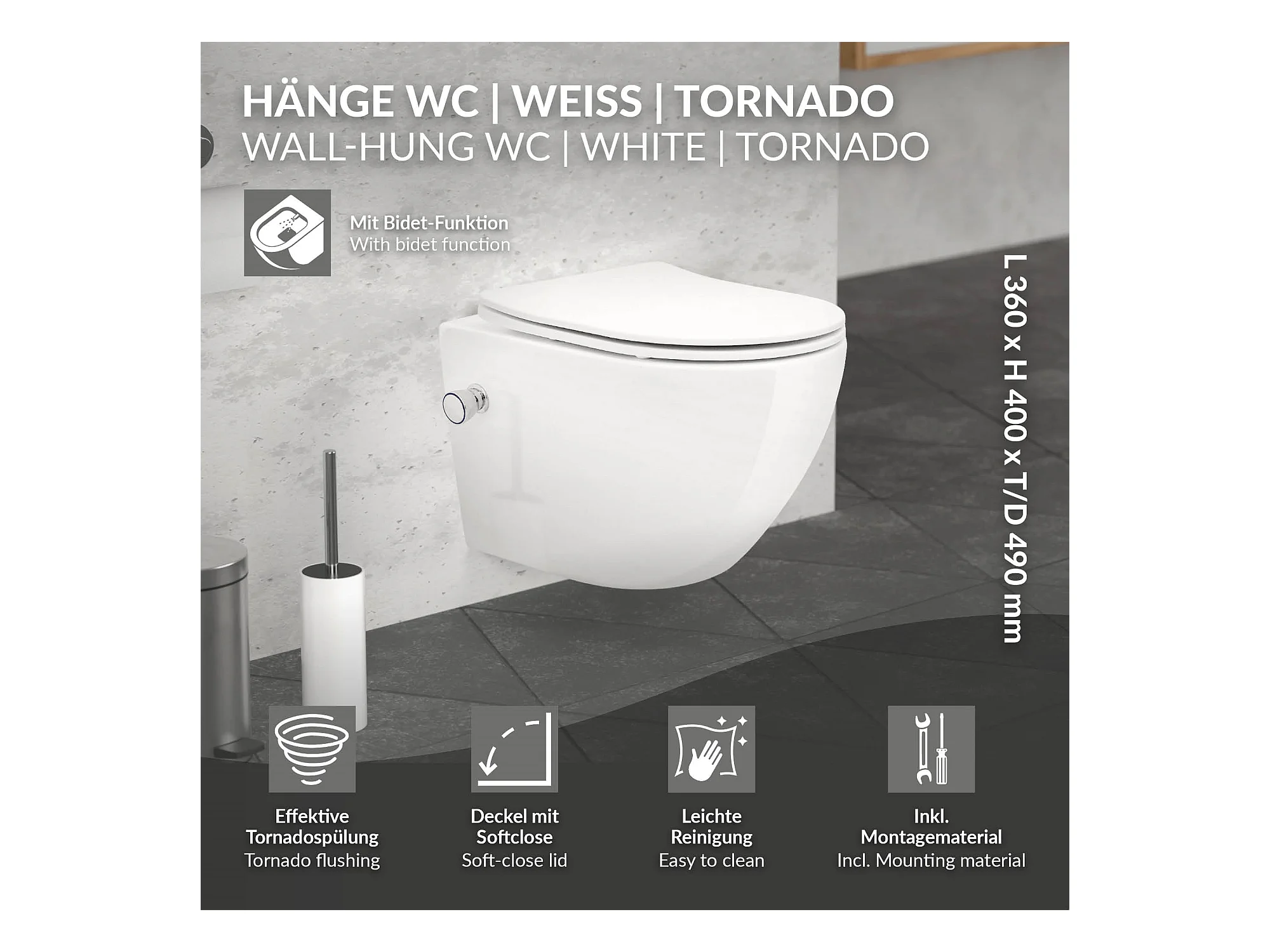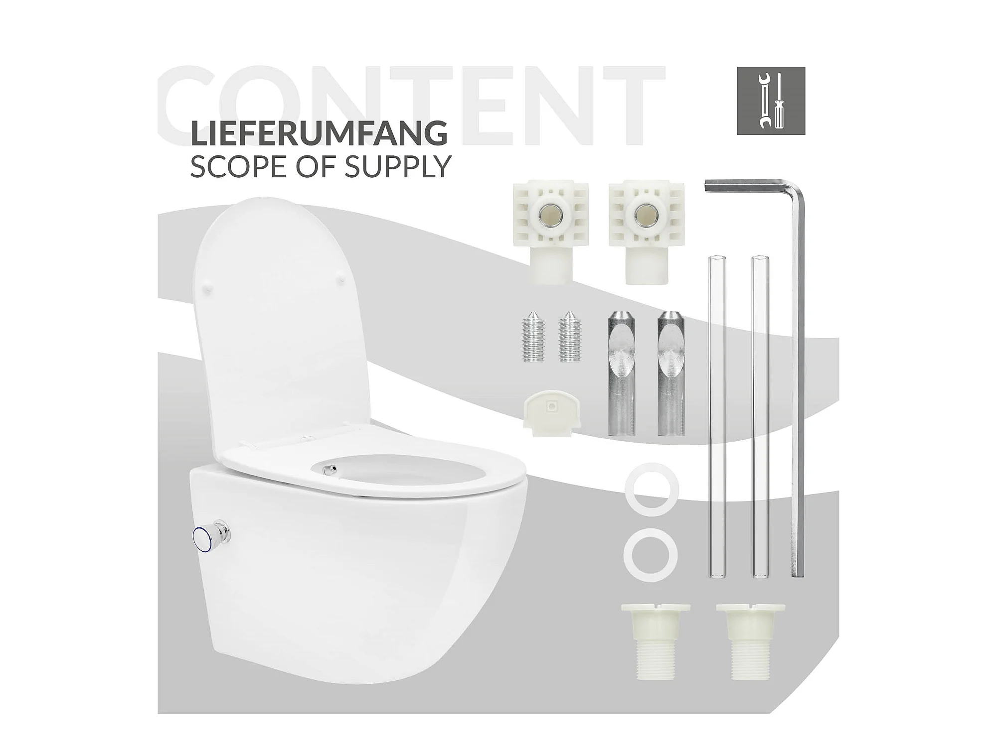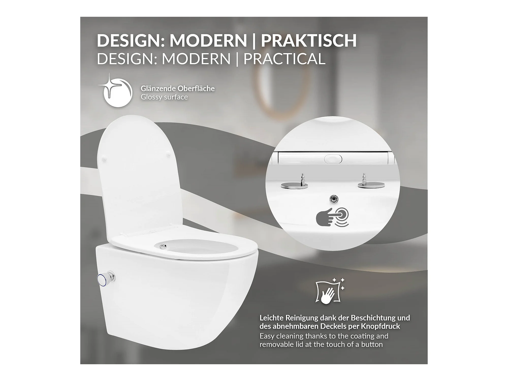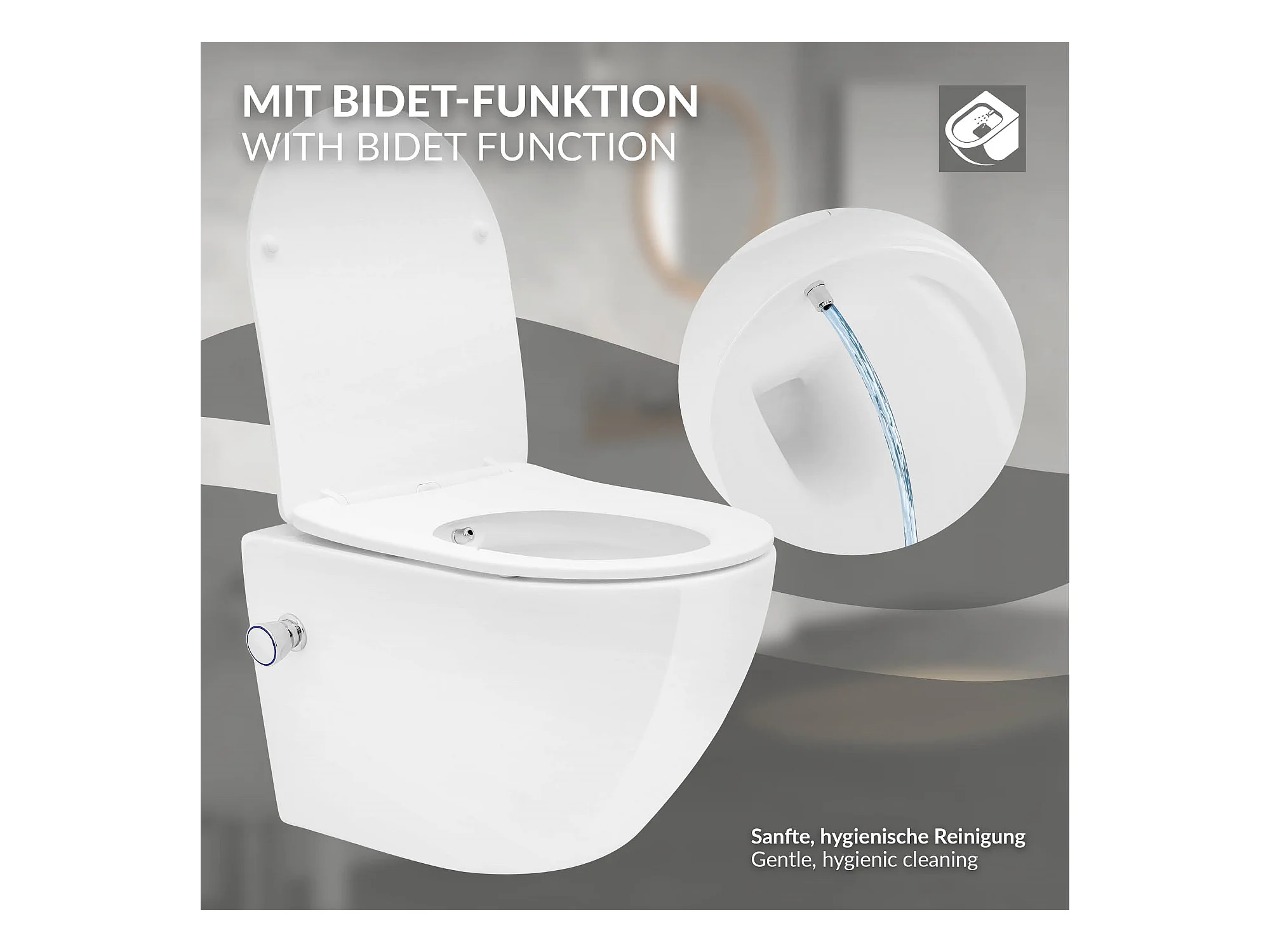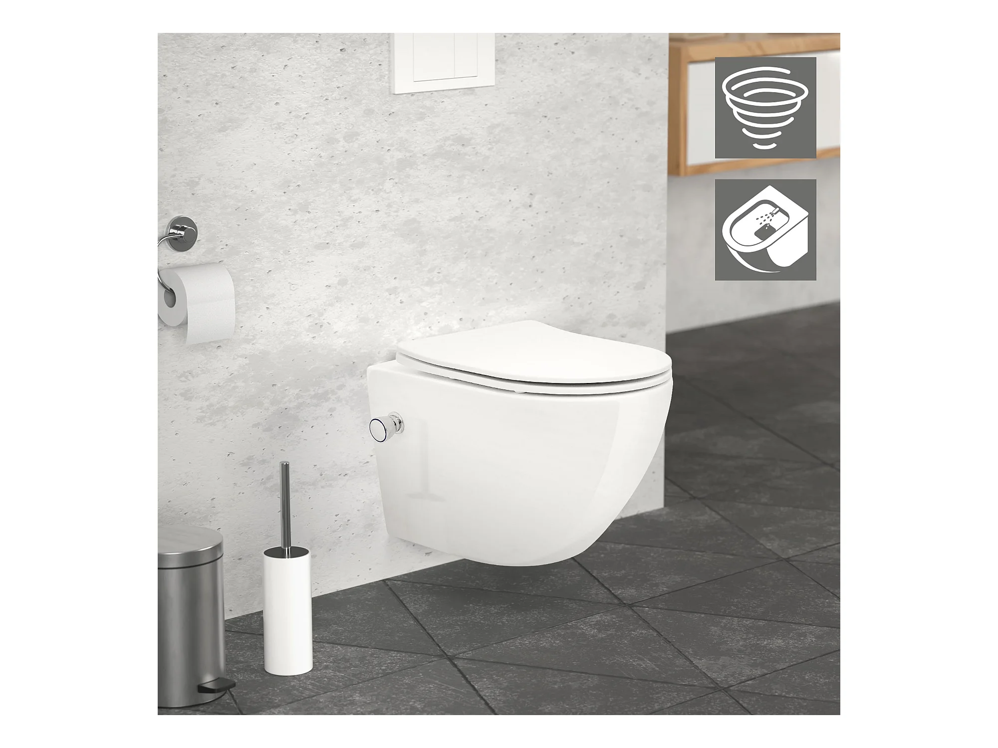 Toilette suspendu sans rebord blanc WC Soft Close fonction bidet salle de bain