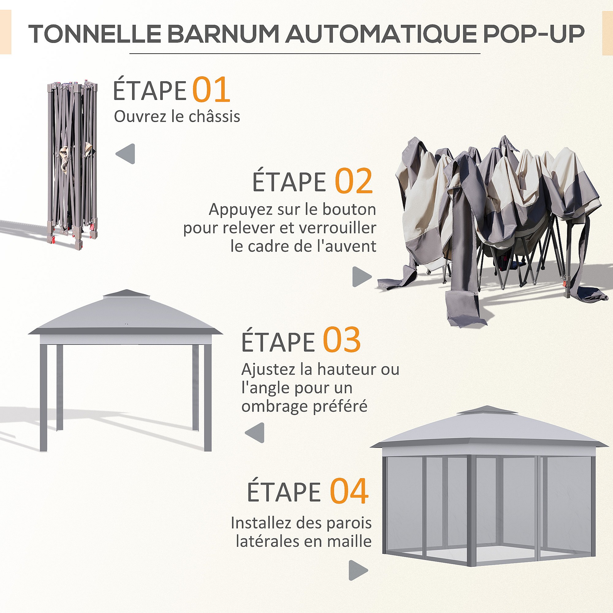 Tonnelle barnum automatique pop-up dim. 3,3L x 3,3l x 2,88H m moustiquaires sac transport métal oxford gris