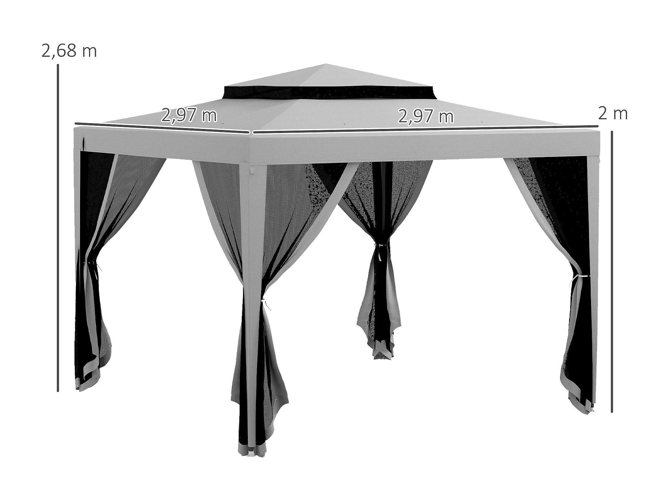 Tonnelle barnum de jardin 3L x 3l m avec 4 moustiquaires amovibles - double toit - métal polyester gris