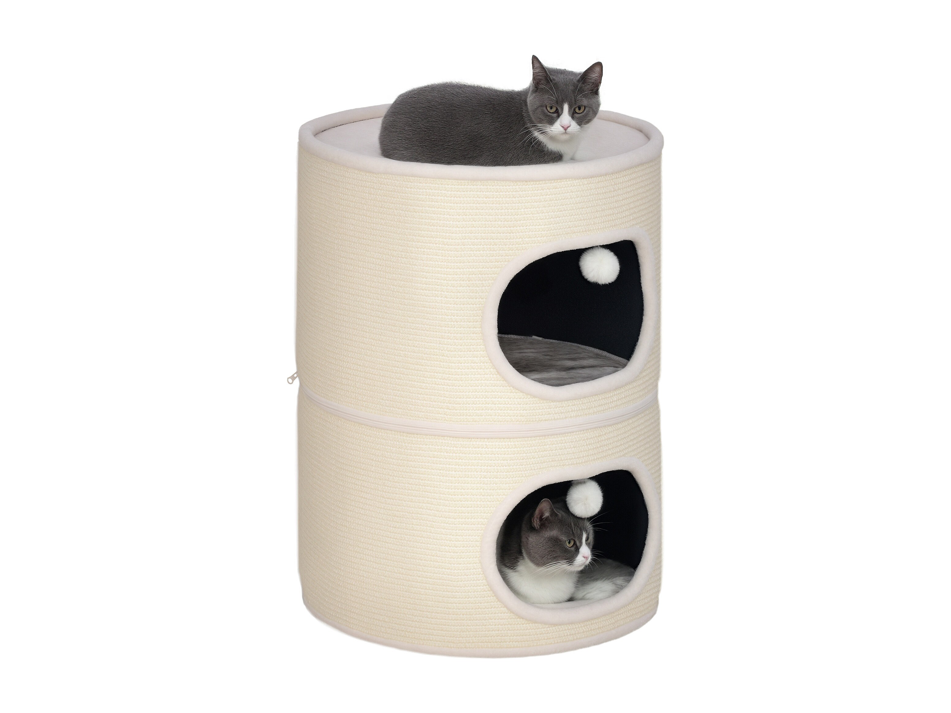Tour pour chat modulable zippée 3 parties - tonneau griffoir chat 2 pompons - sisal naturel peluche crème