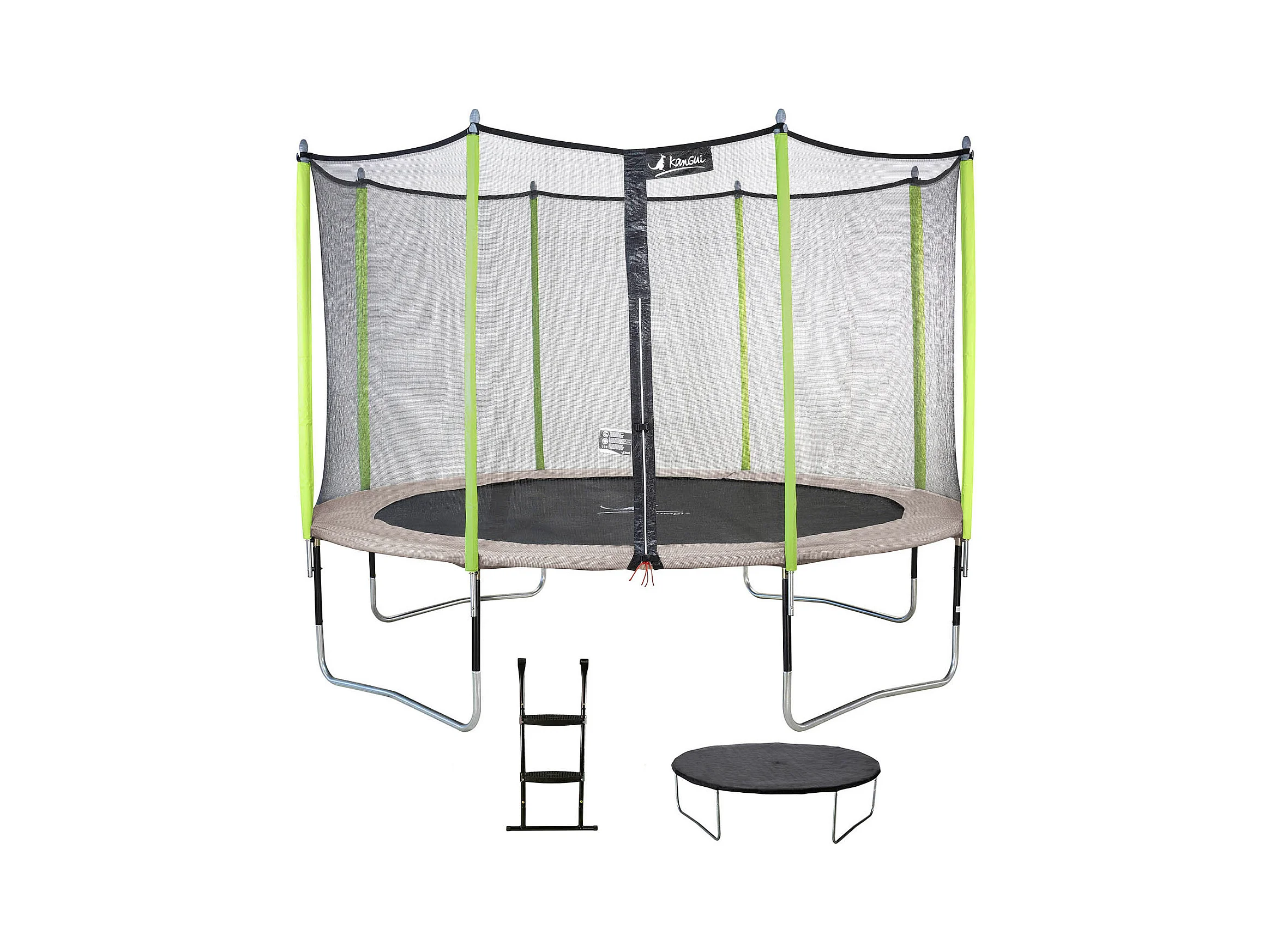 Kangui - Trampoline de jardin 365 cm + filet de sécurité + échelle + bâche de protection JUMPI Taupe/Vert 360.