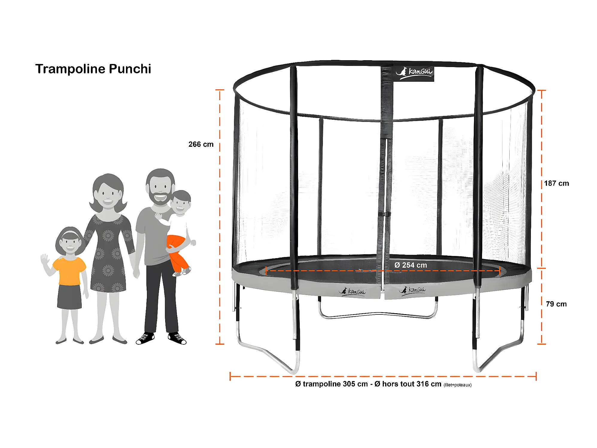 Kangui - Trampoline de jardin rond 305 cm + filet de sécurité + échelle | PUNCHI Bleu 300