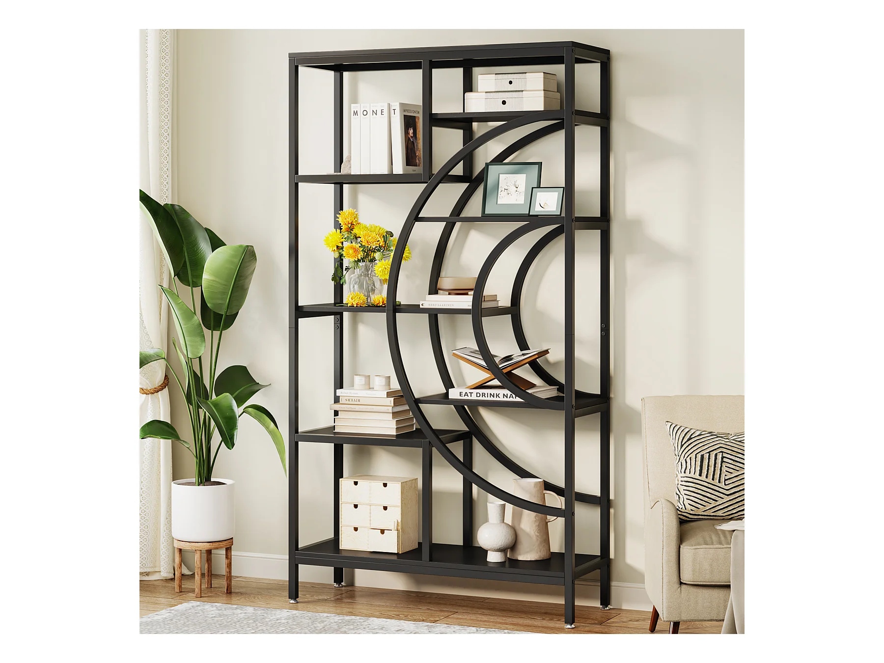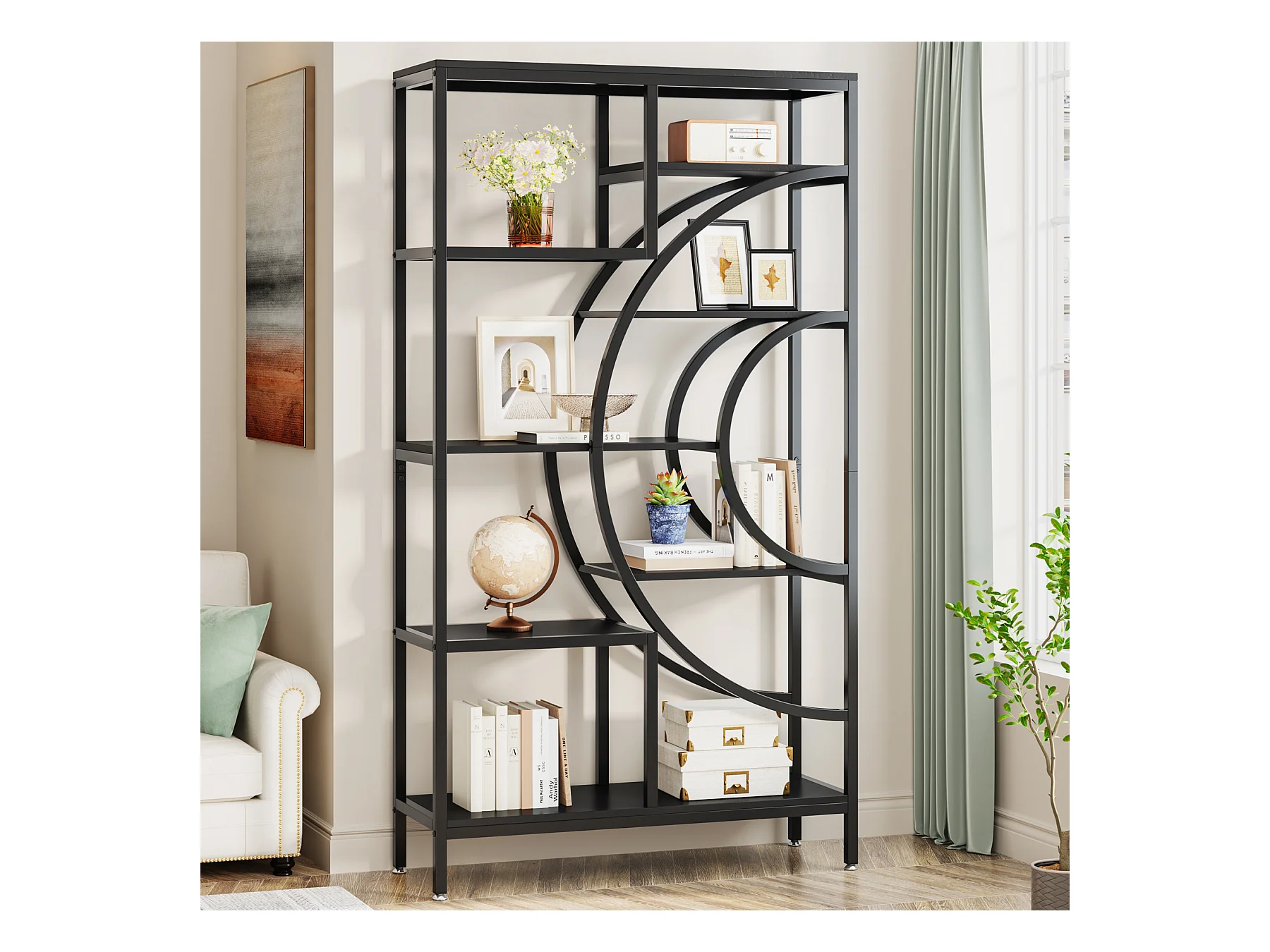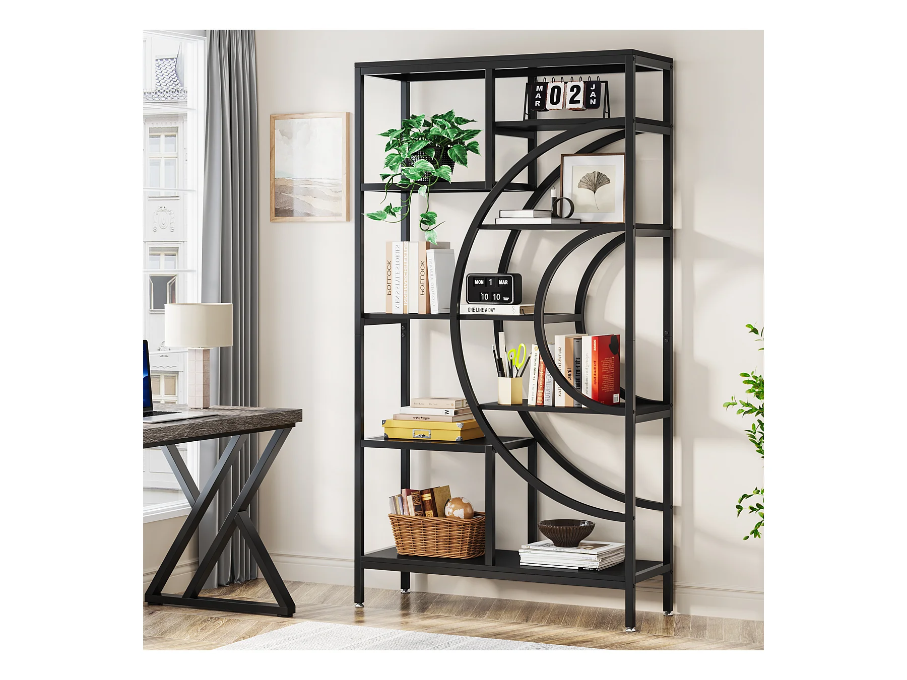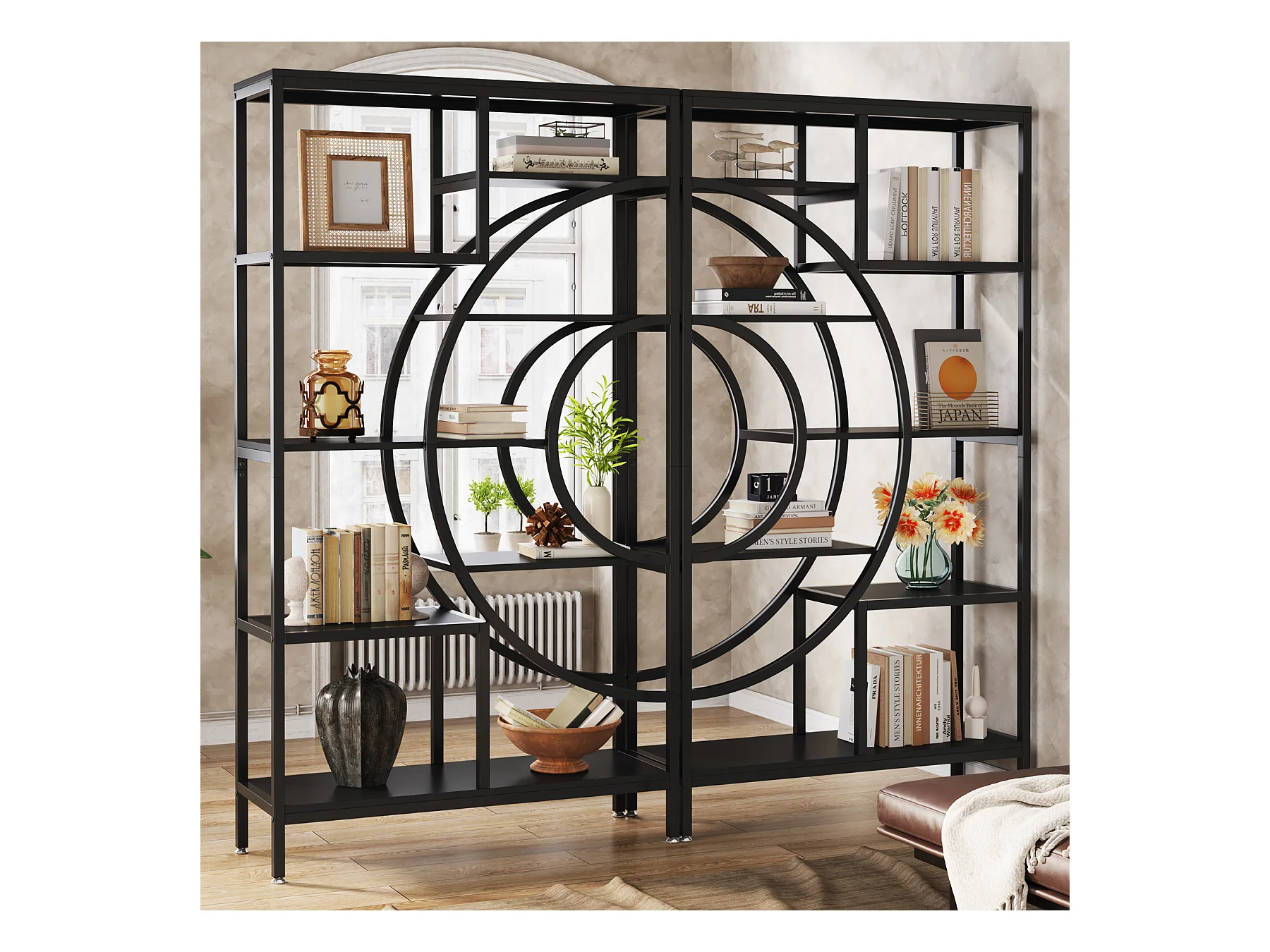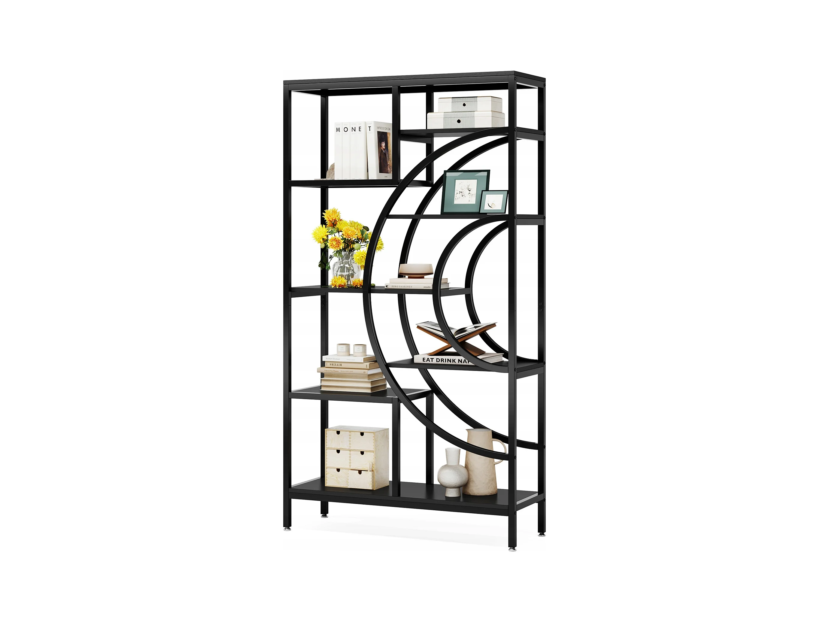 Bibliothèque géométrique, étagères industrielles à 8 Niveaux, bibliothèque Rustique avec Cadre en méta (Noir, 1)