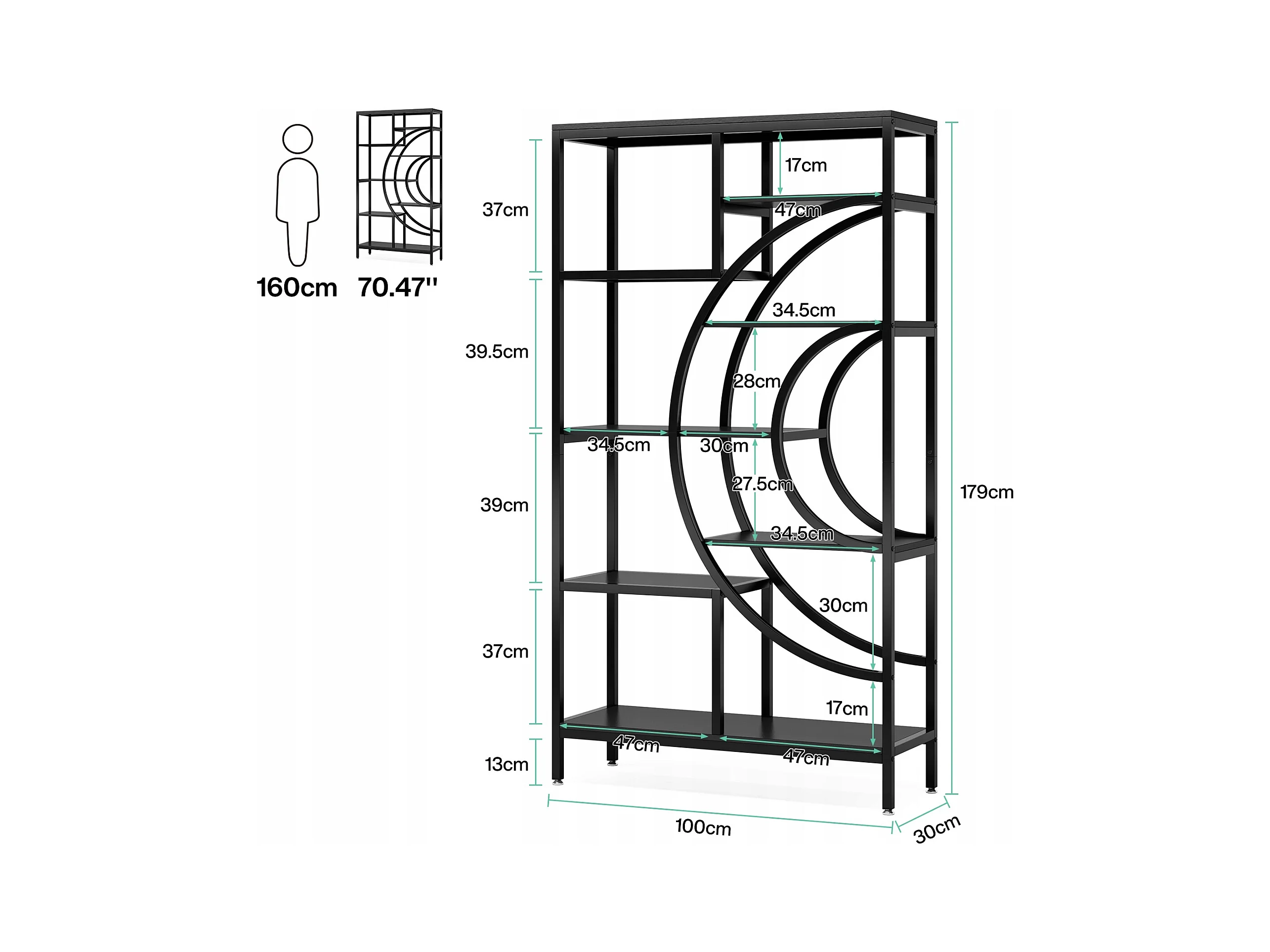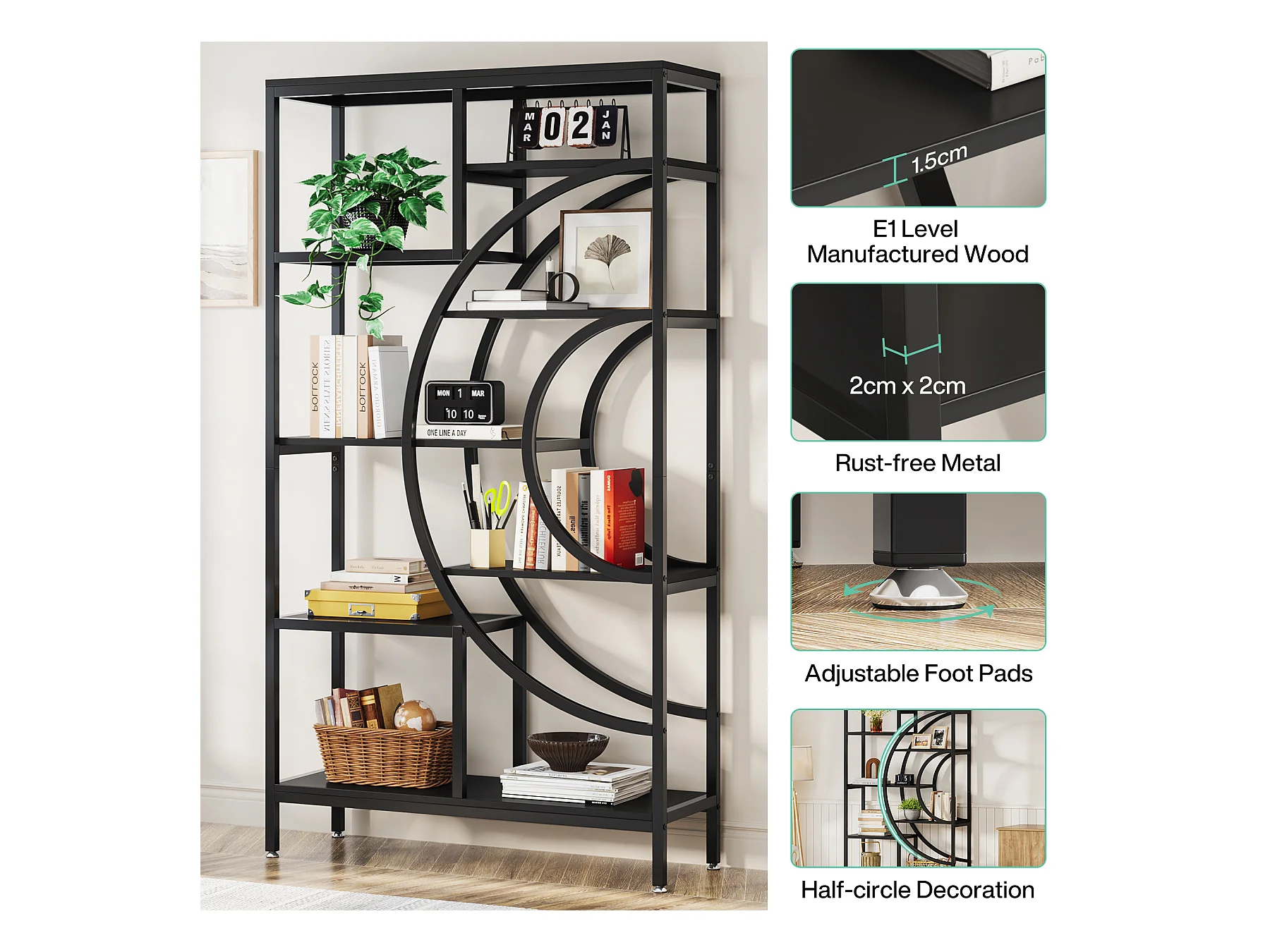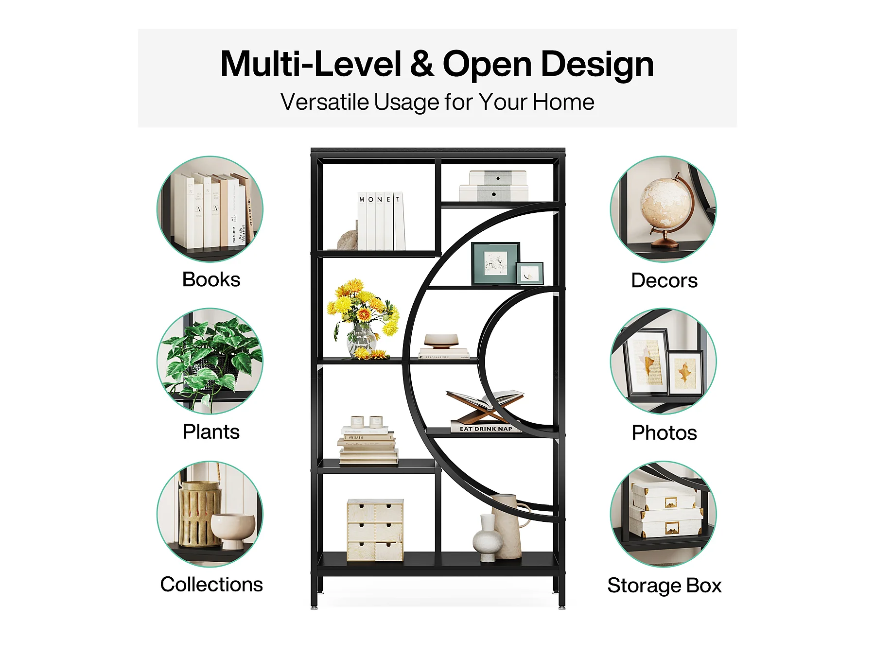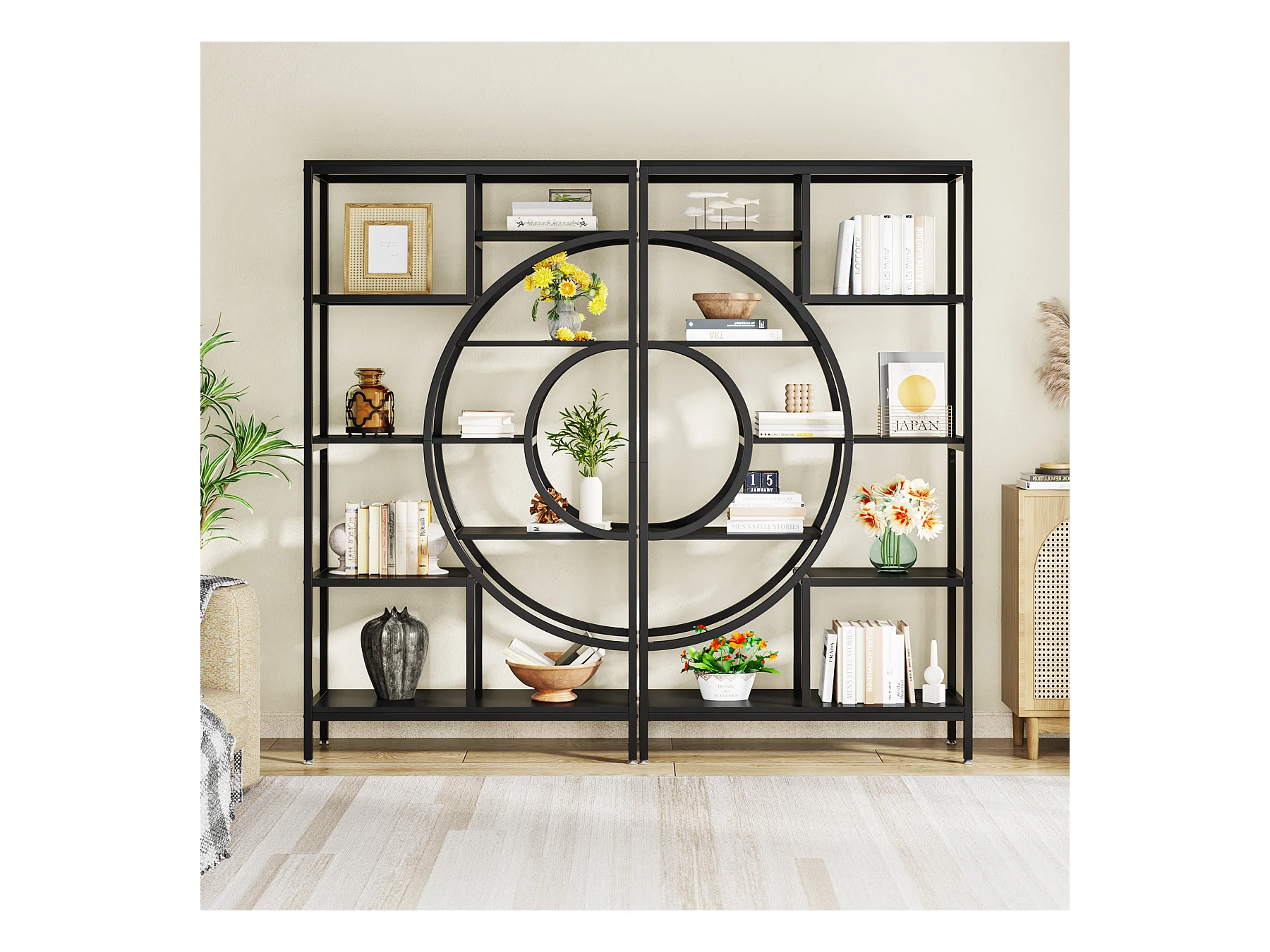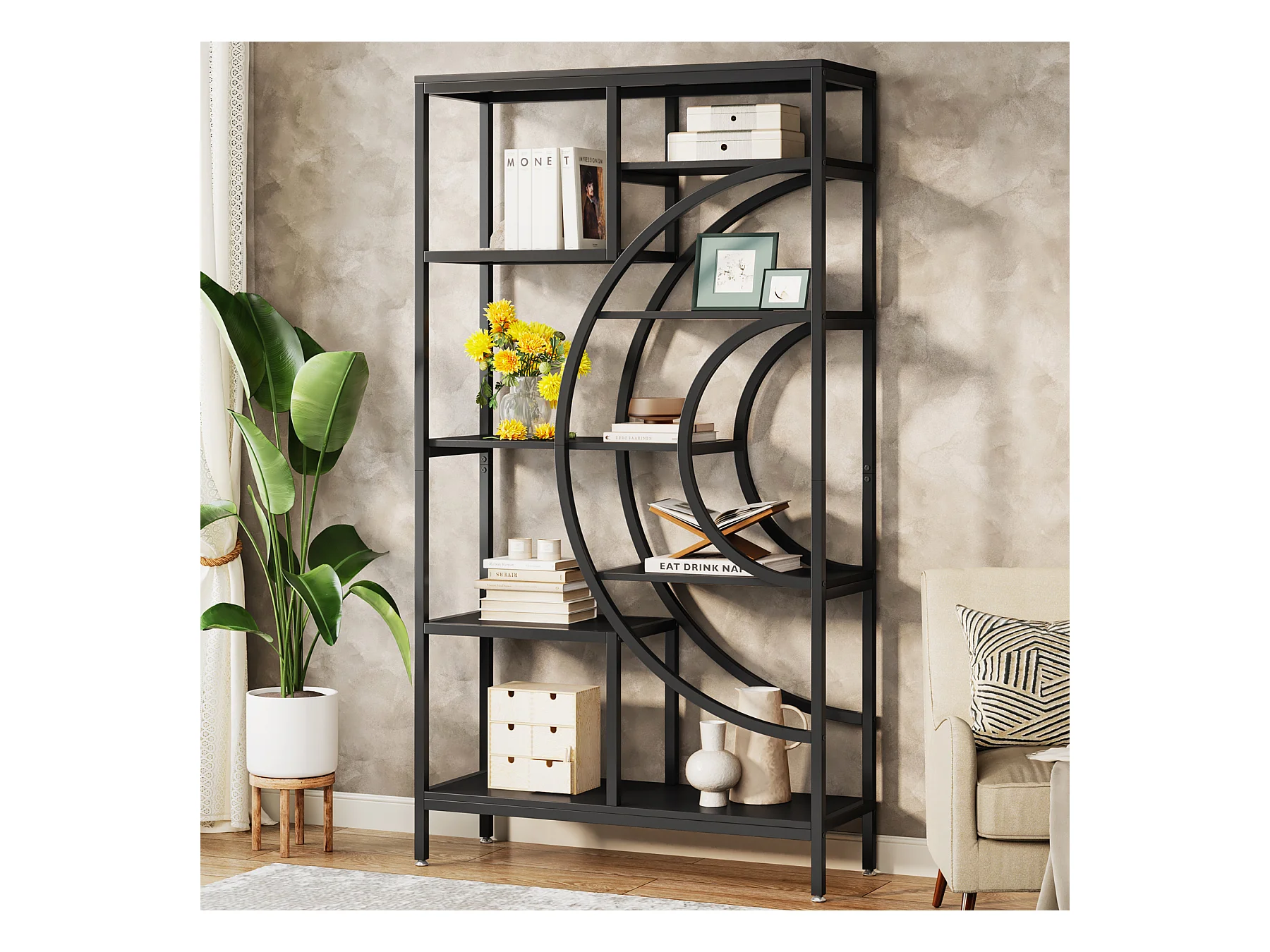 Bibliothèque géométrique, étagères industrielles à 8 Niveaux, bibliothèque Rustique avec Cadre en méta (Noir, 1)