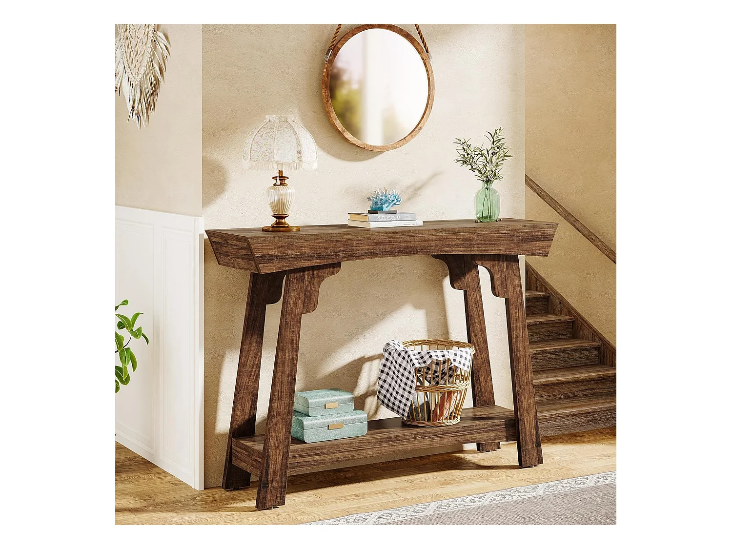 Table console de 105 cm avec rangement, 2 niveaux en bois, avec étagère, ferme étroite, table derrière le canapé pour salon, marron rustique
