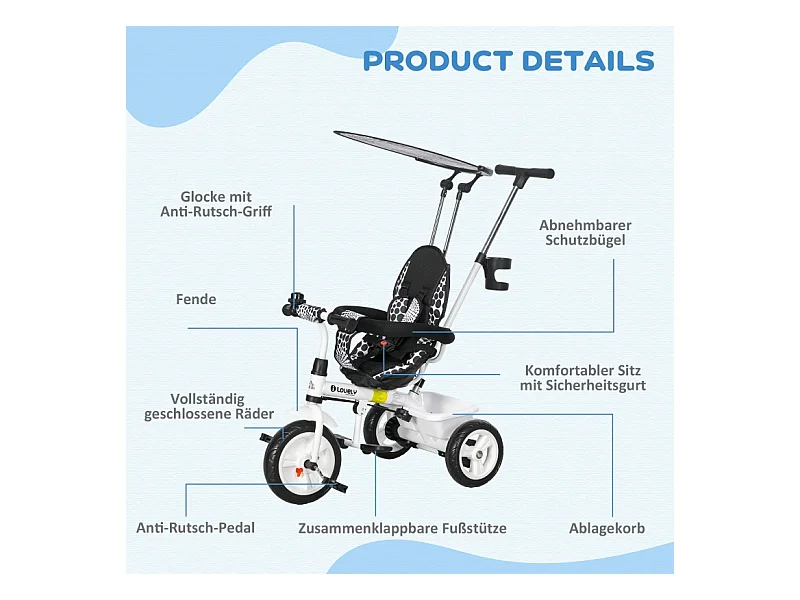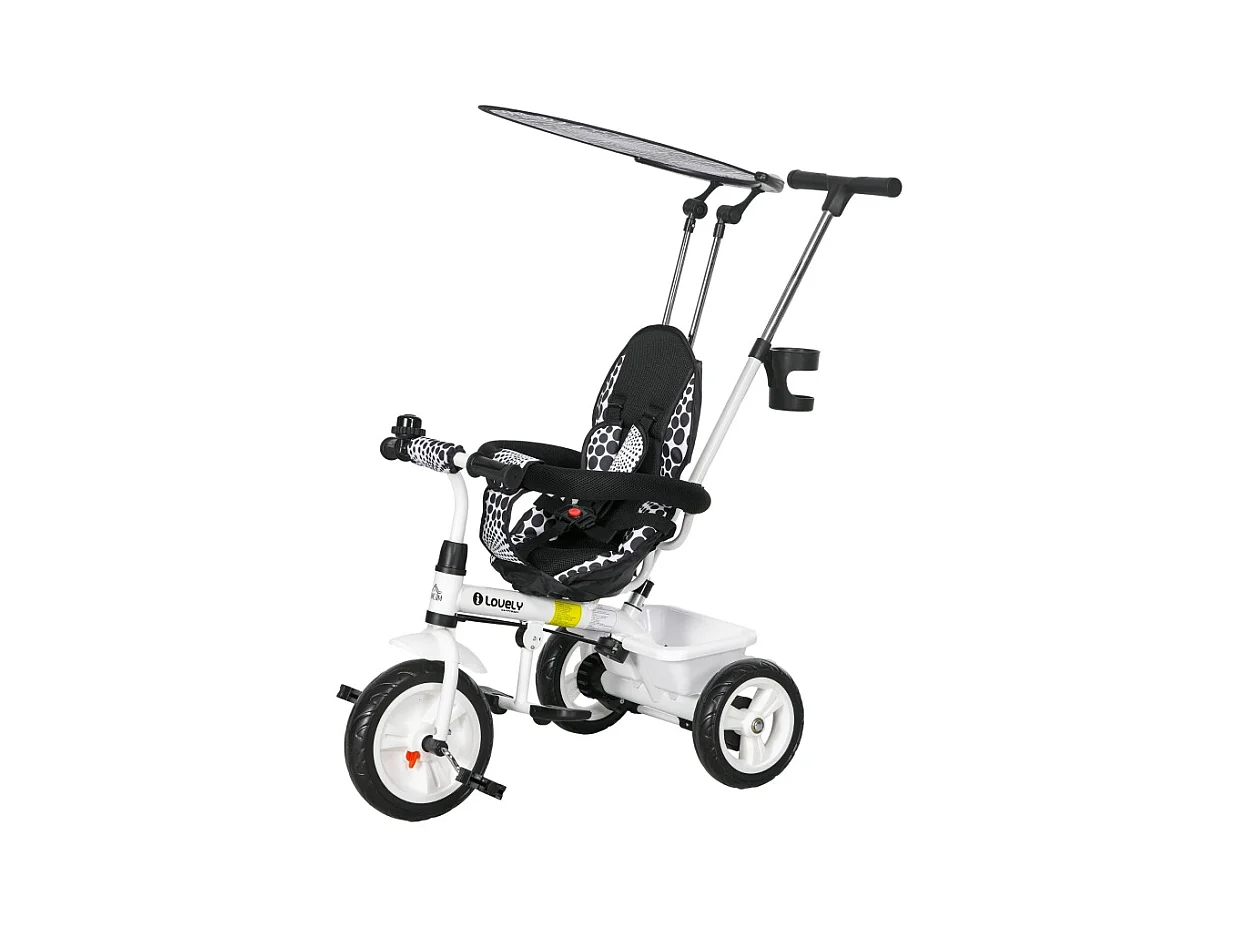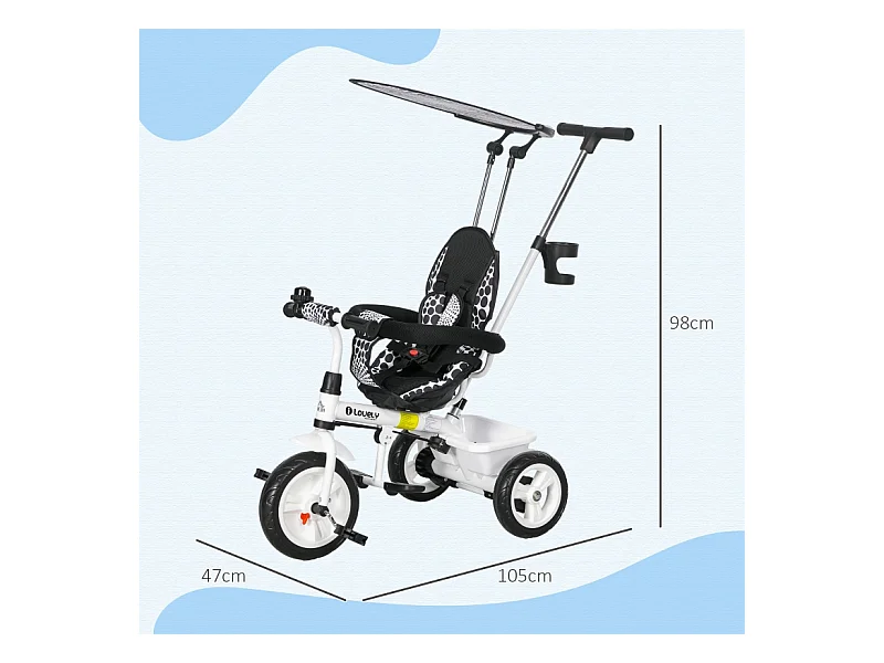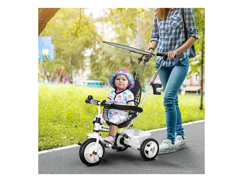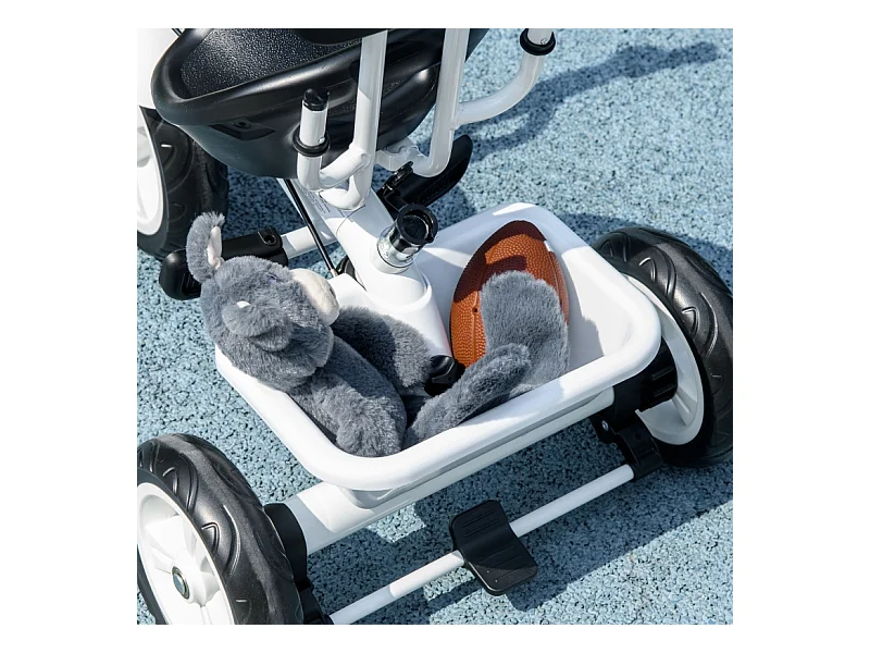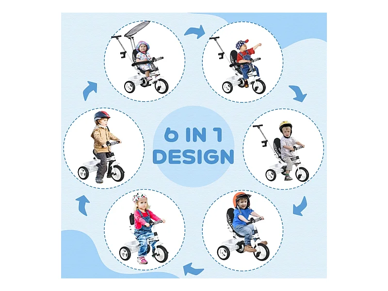 Tricycle évolutif 6-en-1 avec canne parentale, panier, harnais et toit, métal, blanc (105x47x98cm)