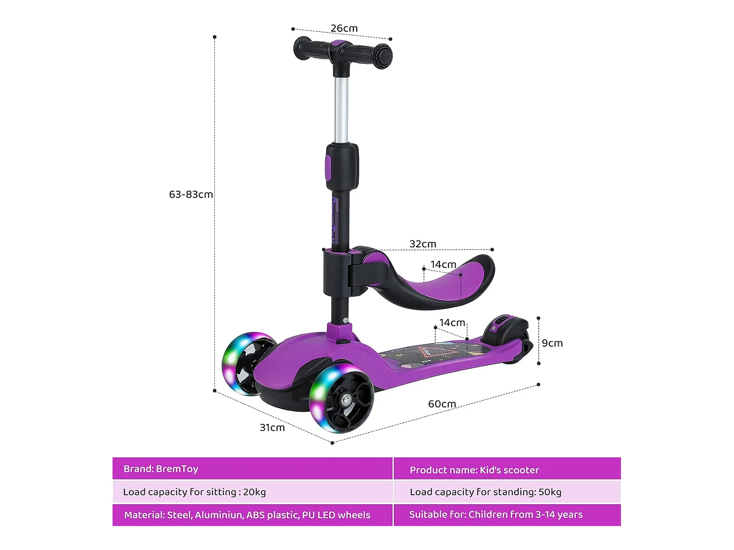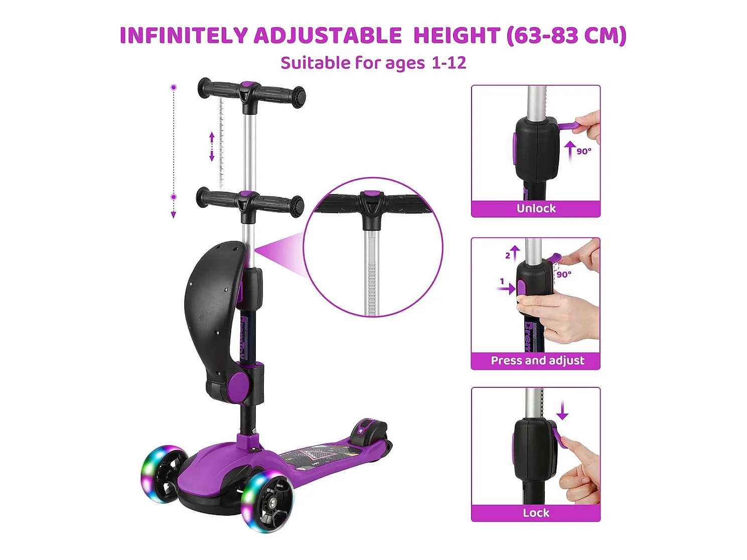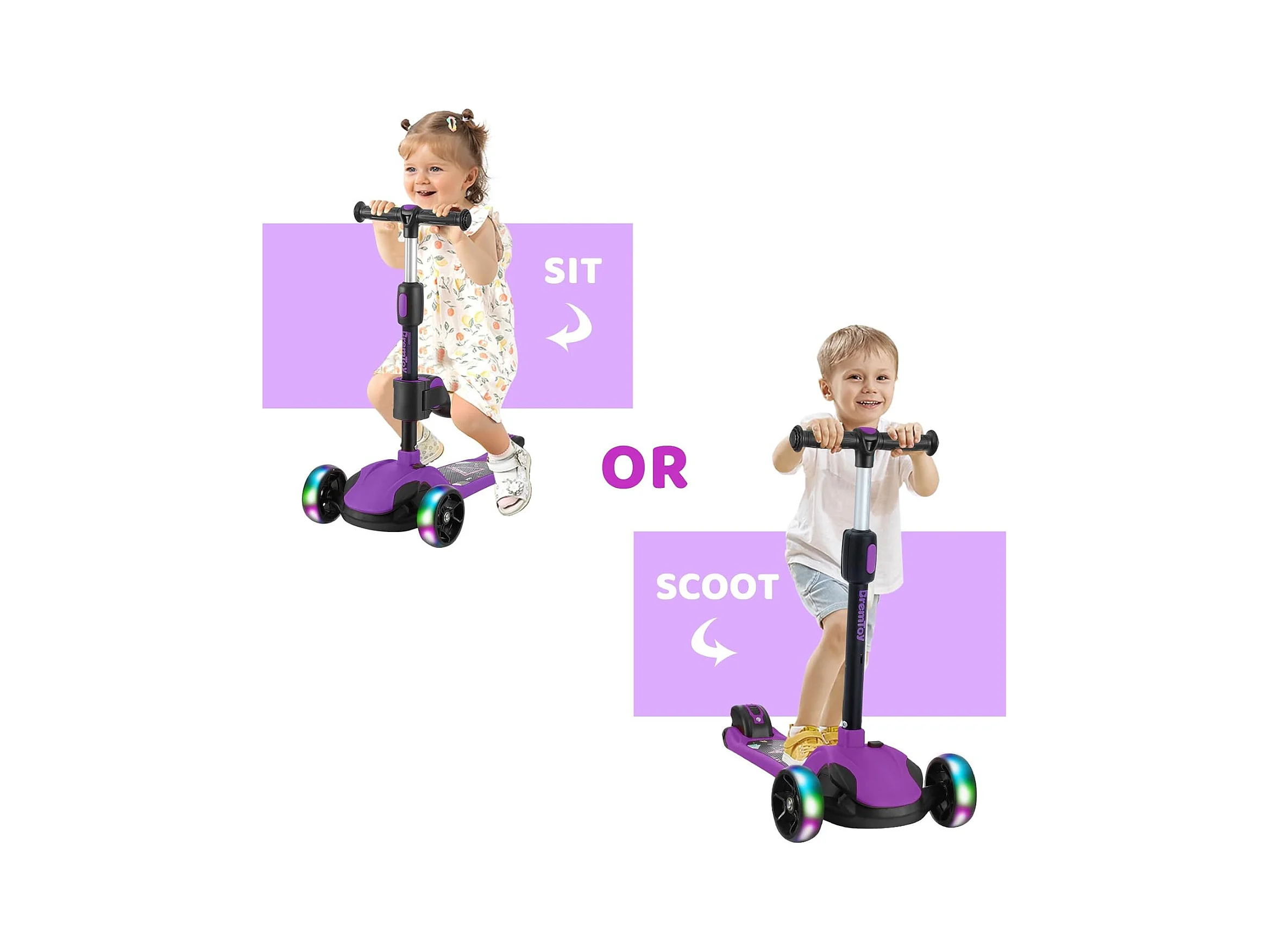 Trottinette Enfant Pliable BremToy avec Siège, Roues LED et Guidon Réglable en Hauteur pour 2-8 Ans