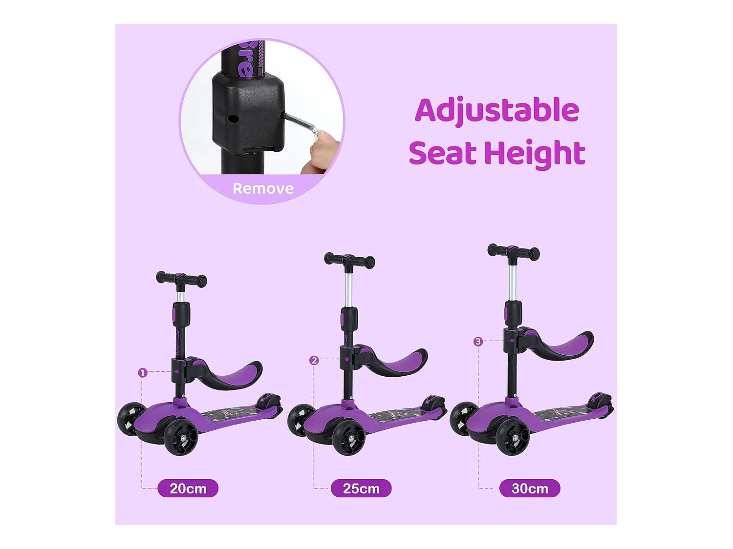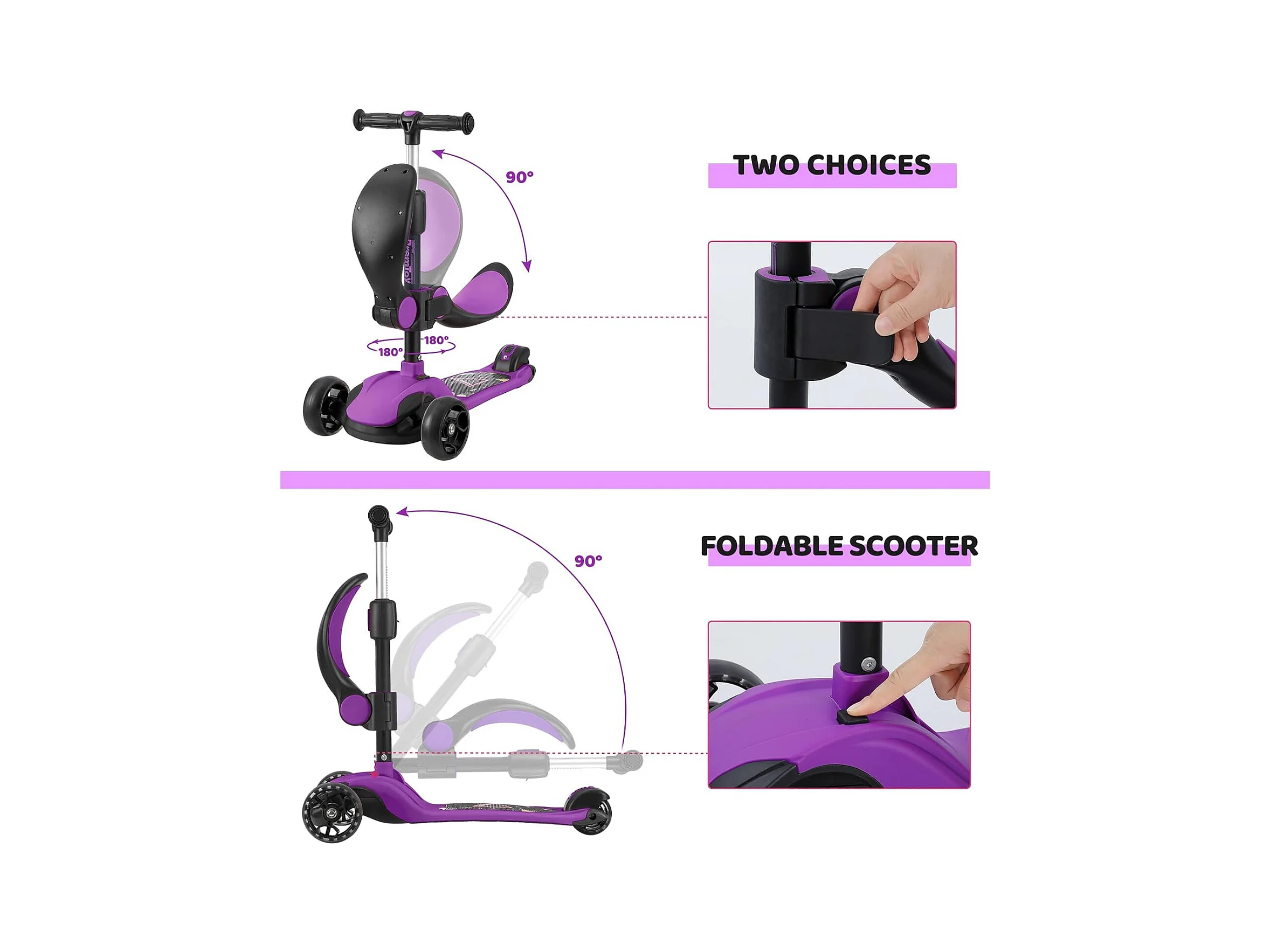 Trottinette 3-en-1 pour Enfant avec Siège Amovible, Grandes Roues LED, Réglable en Hauteur à partir de 2 Ans, rose
