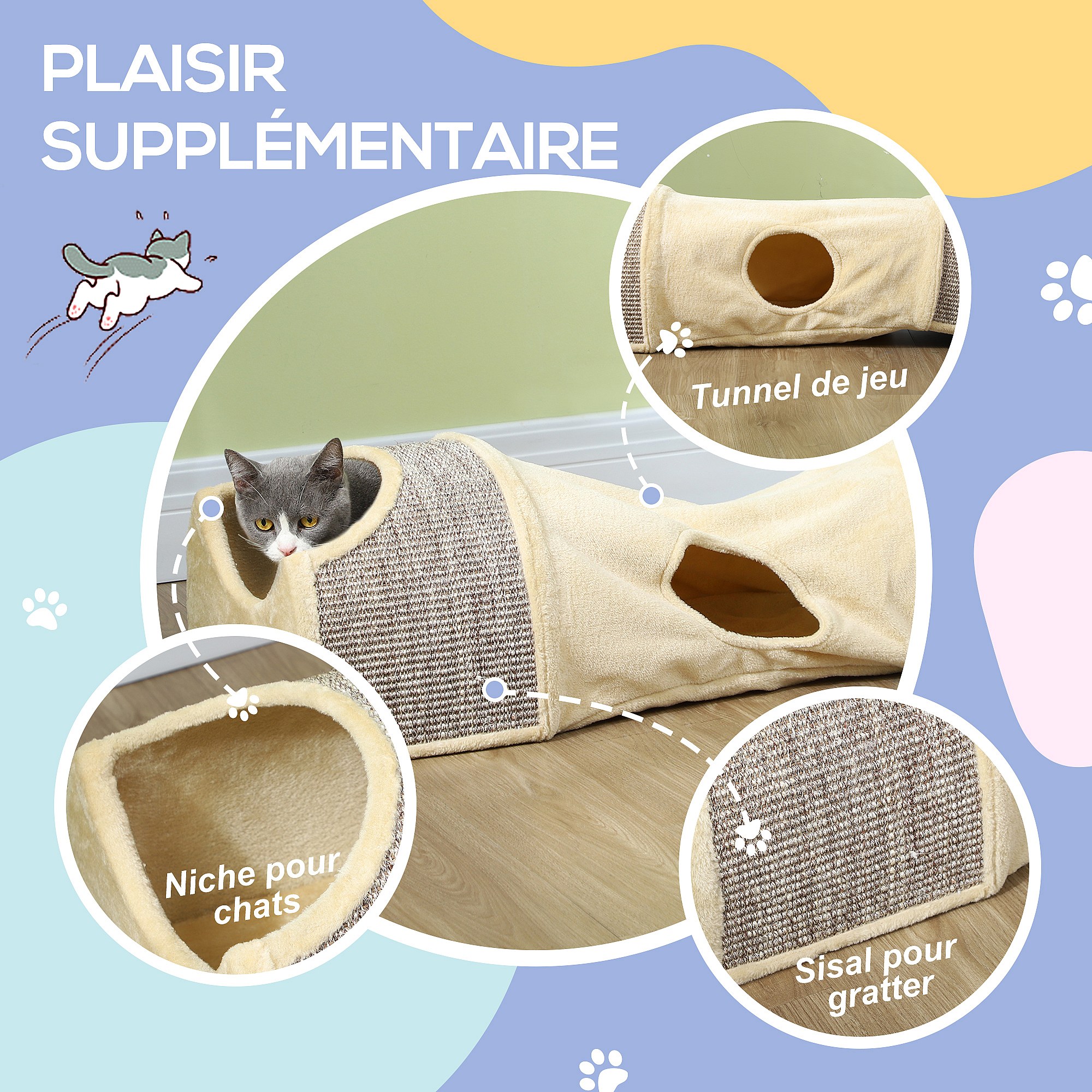 Tunnel pour chat modulable - 3 portes, 2 griffoirs - sisal peluche beige