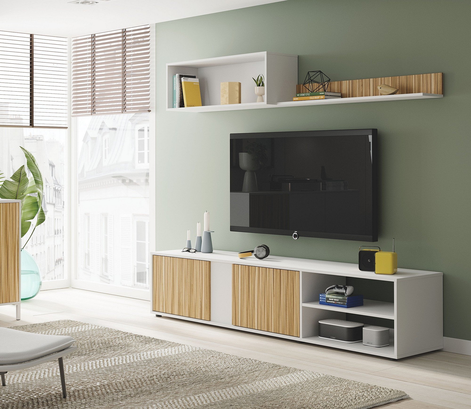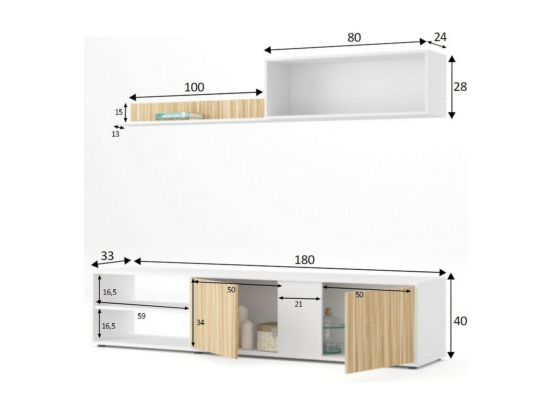 Unité murale Daasmundse, Meuble TV meuble de salon, Composition d'ensemble de salon, Ensemble de salon avec unité murale, 180x33h40 cm, Blanc et Chêne