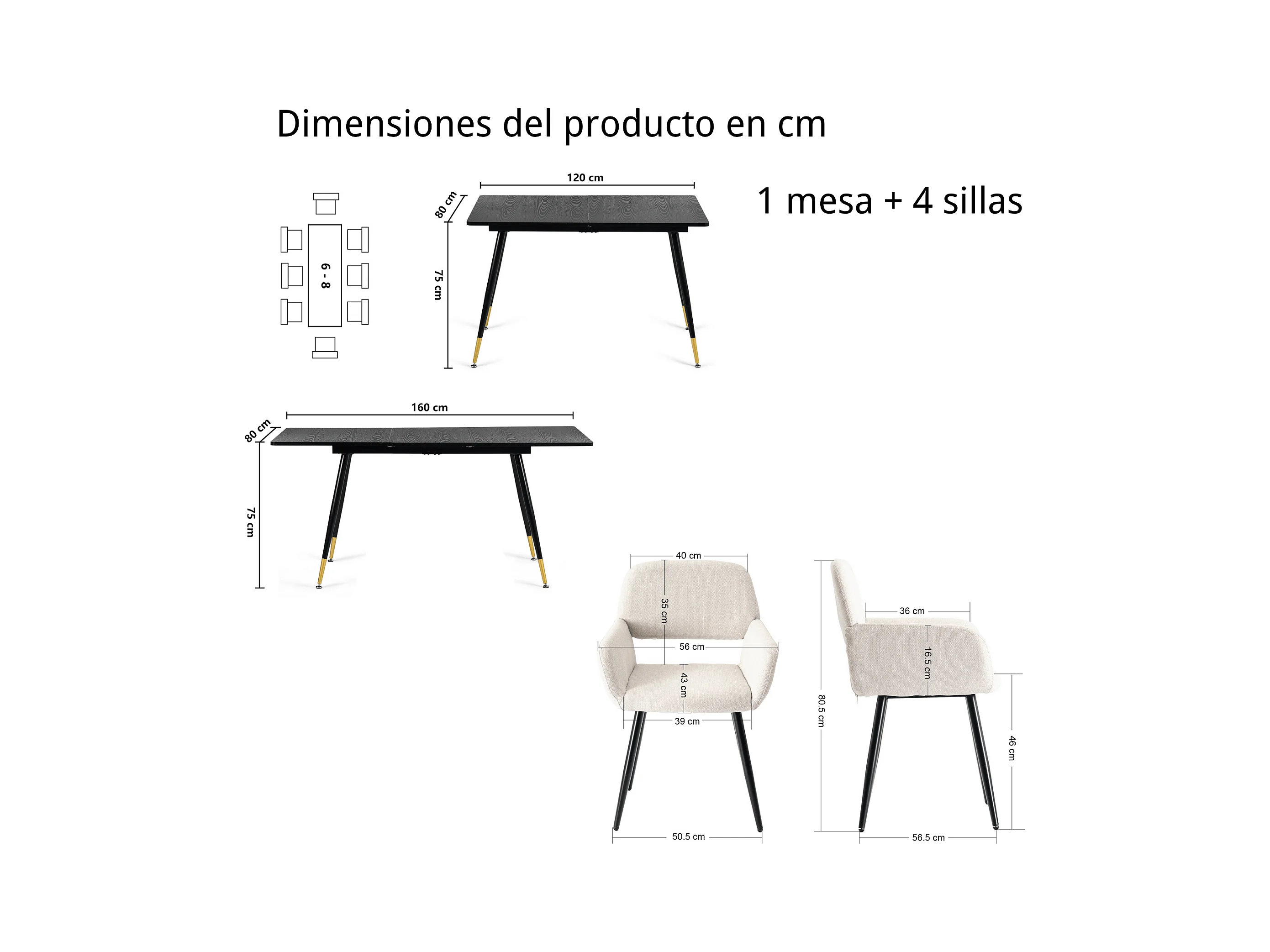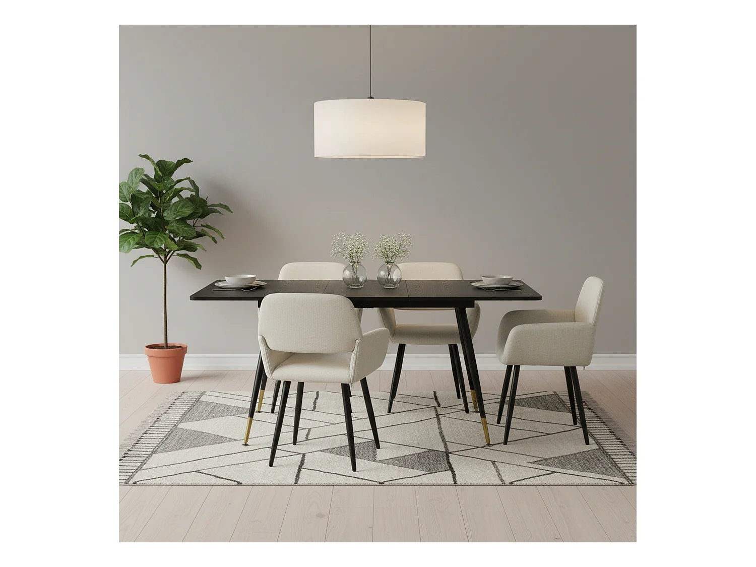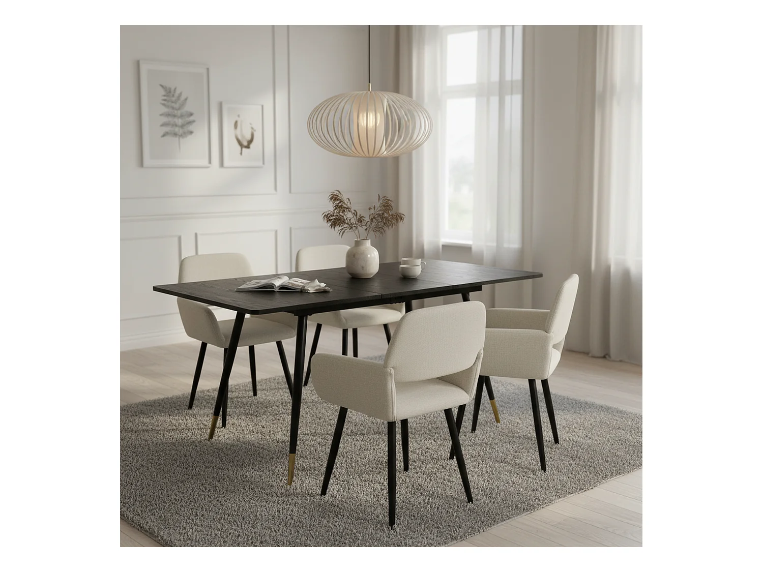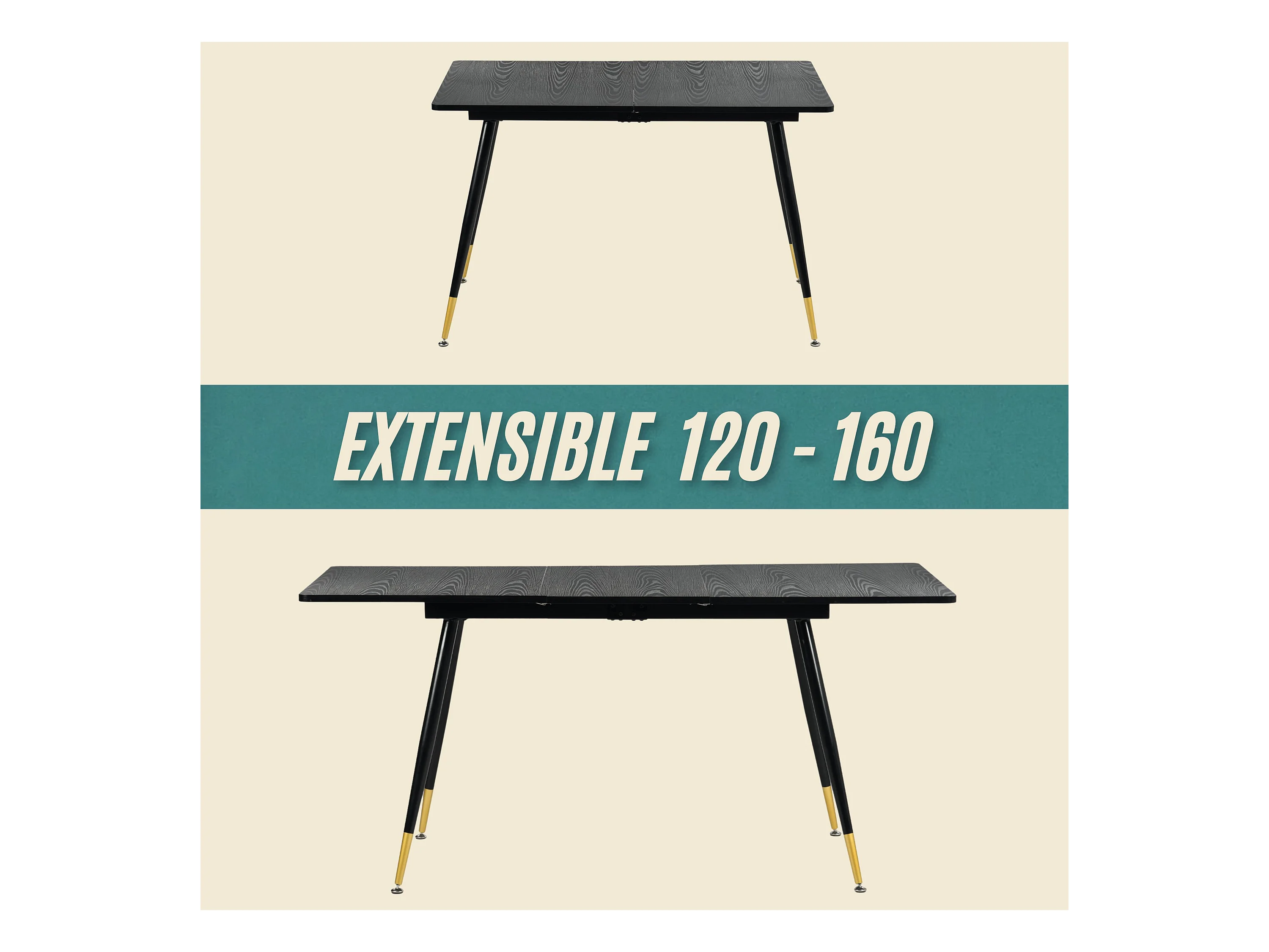 URBAN MEUBLE Ensemble table extensible effet bois noire 120-160 et 4 chaises tissu beige