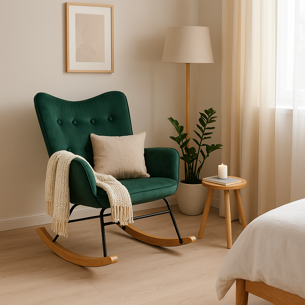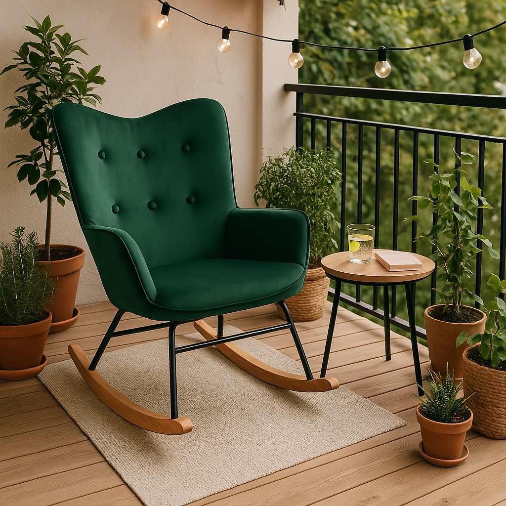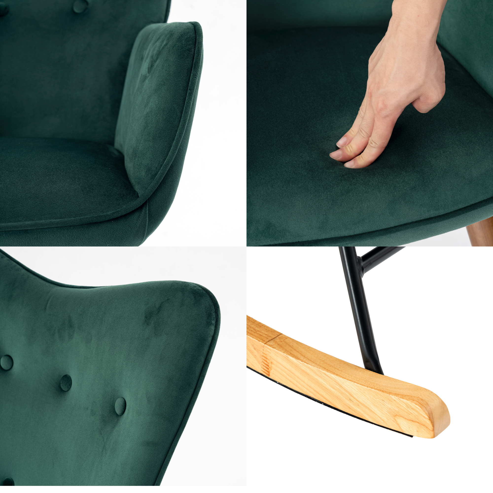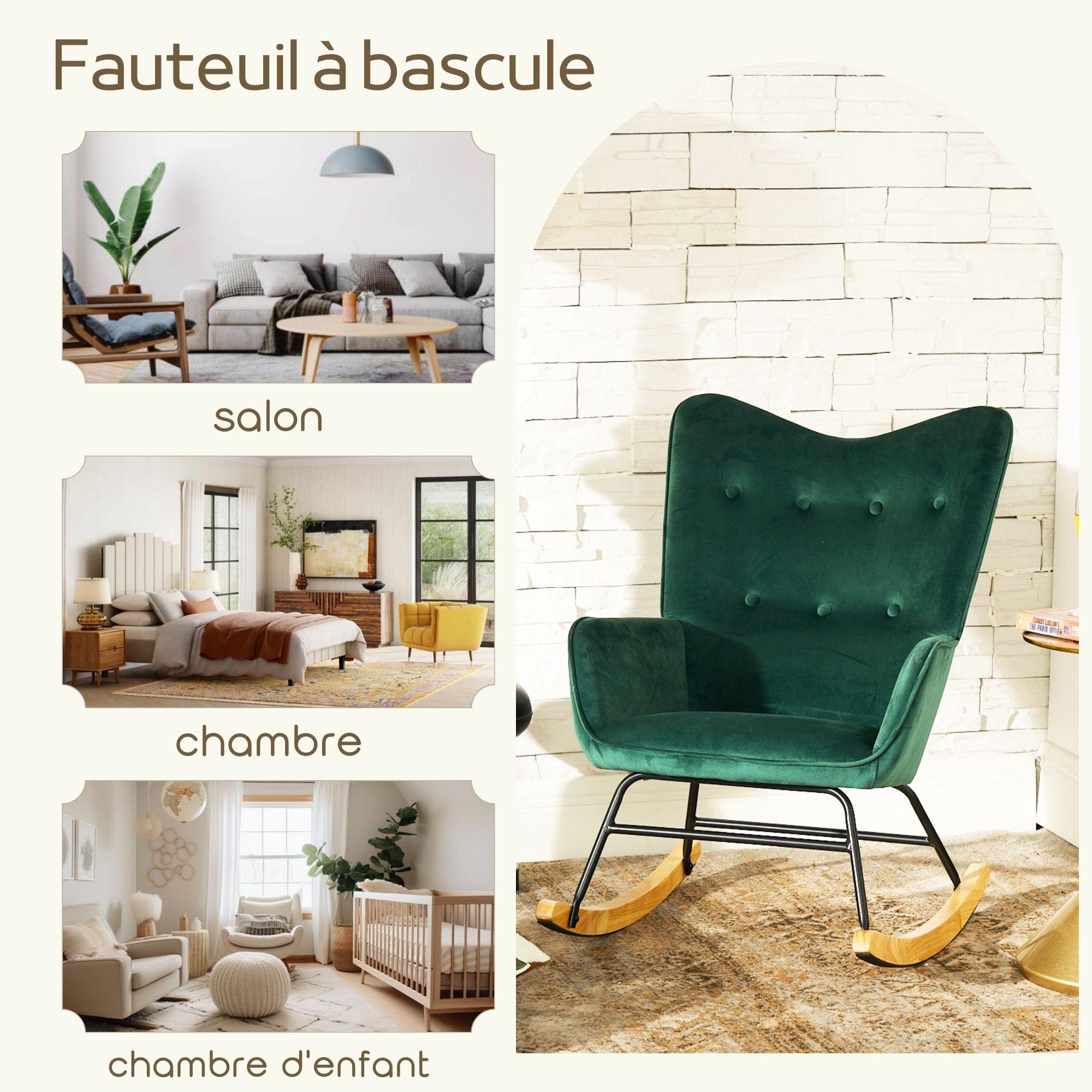 URBAN MEUBLE Fauteuil à bascule Scandinave velours vert pieds en bois foncé
