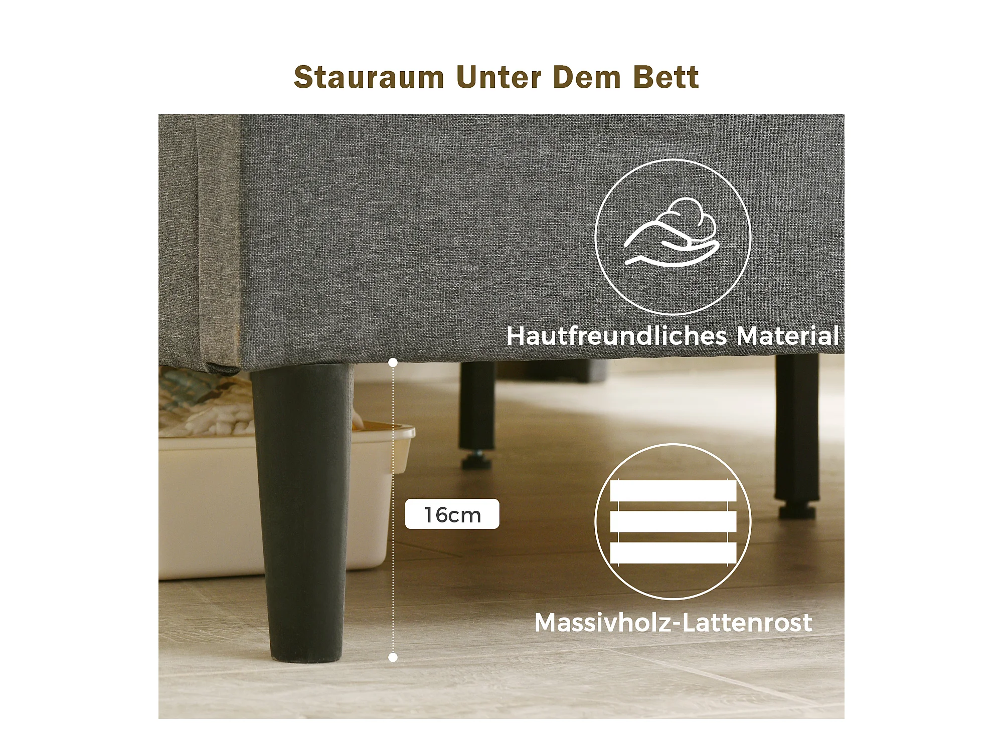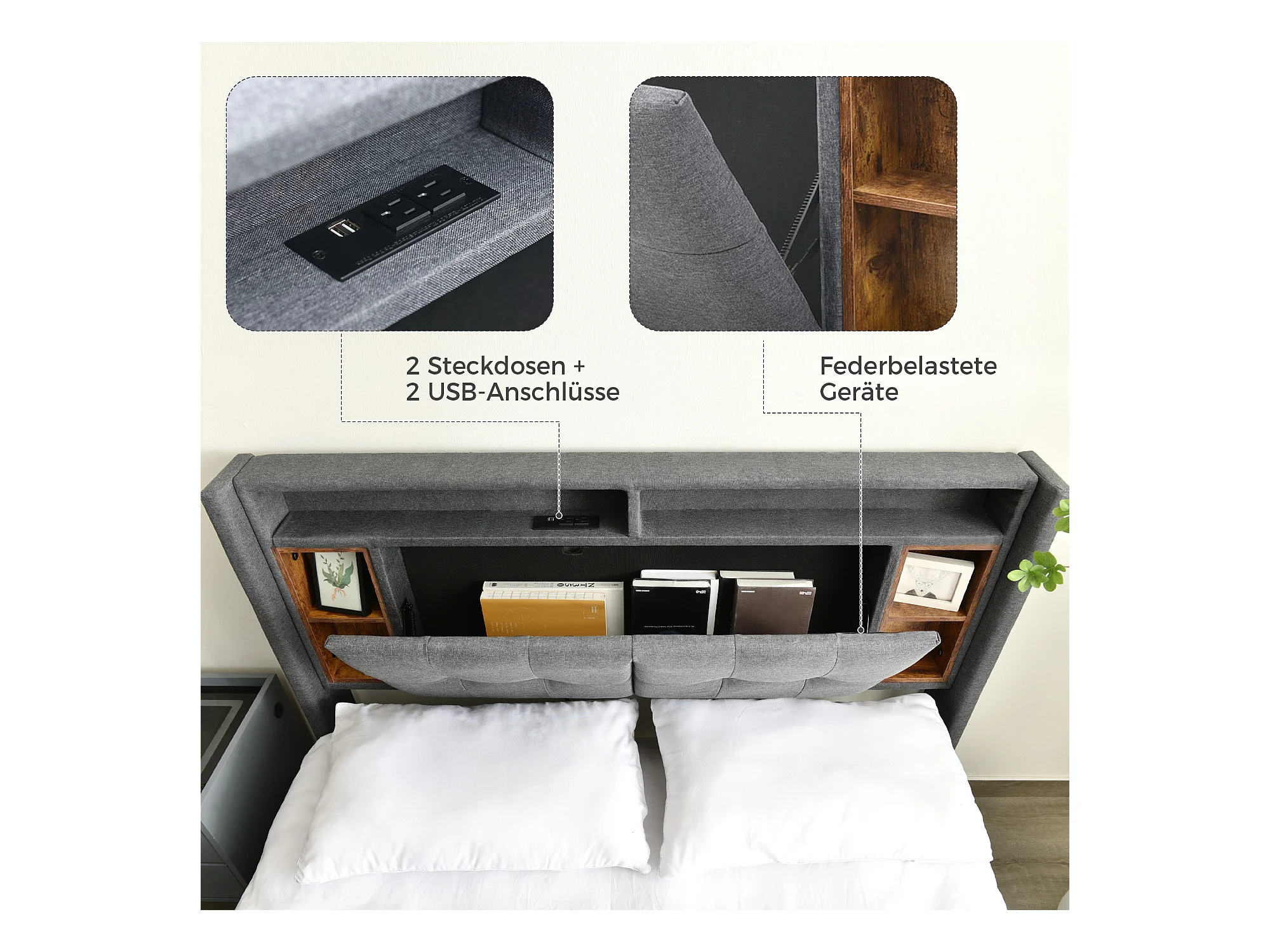 URBAN MEUBLE Lit double capitonné gris avec tête de lit rangement éclairage LED 160*200