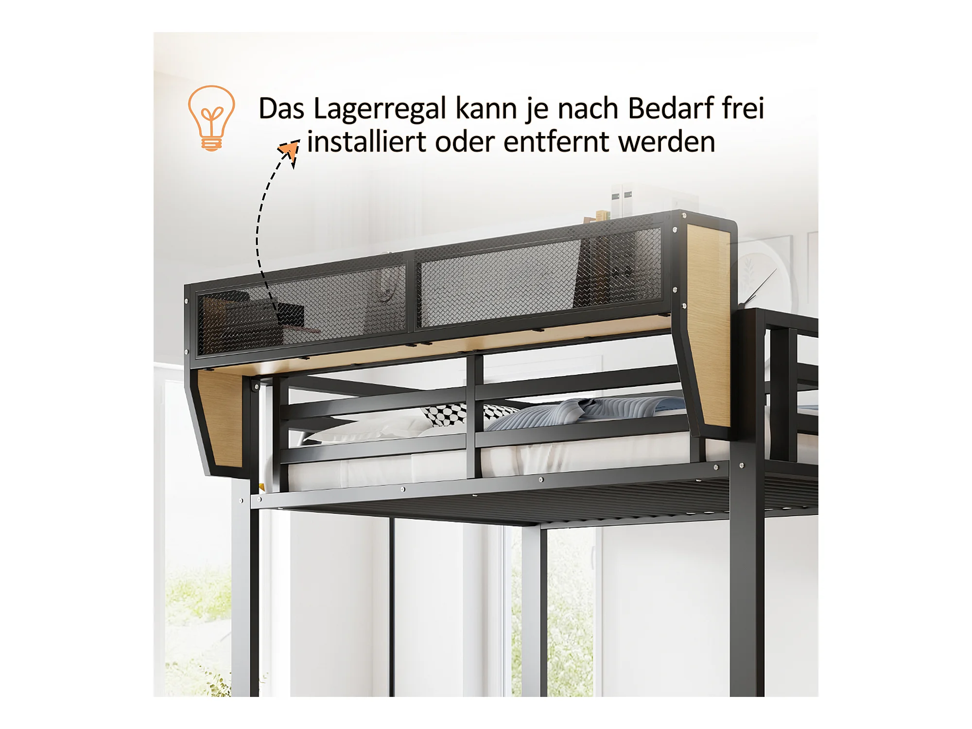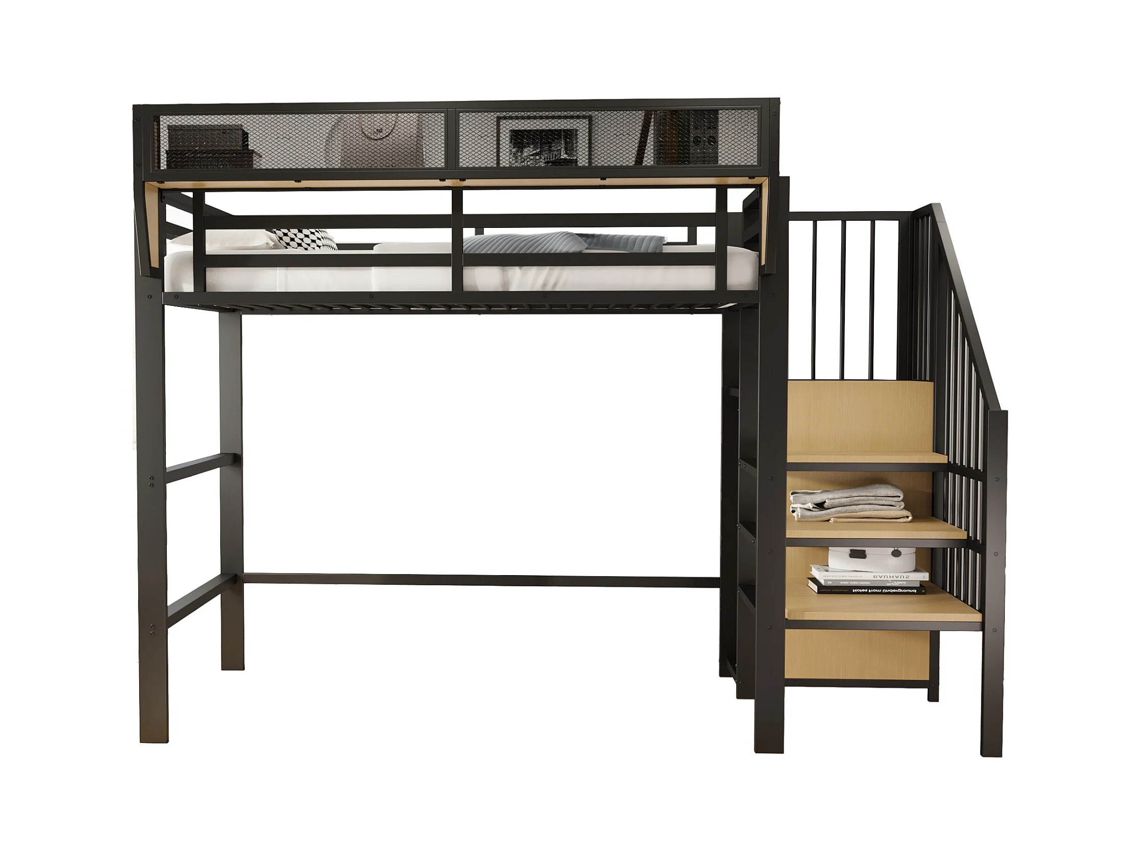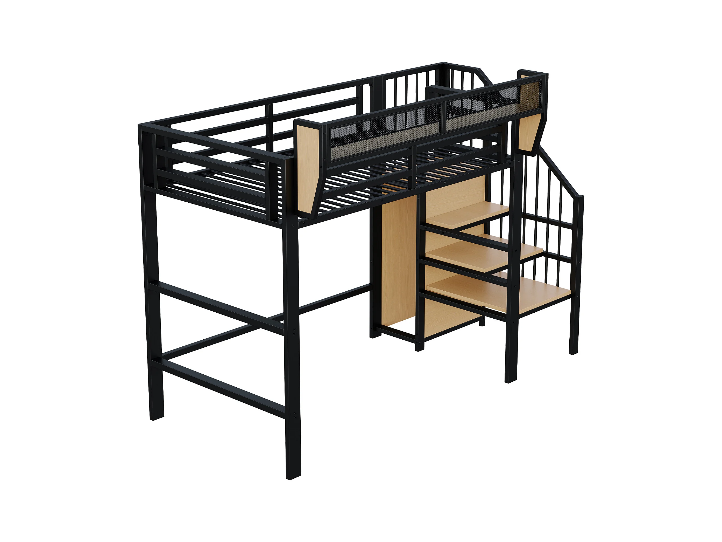 URBAN MEUBLE Lit mezzanine métal noir avec étagères, penderie et escalier 90*200
