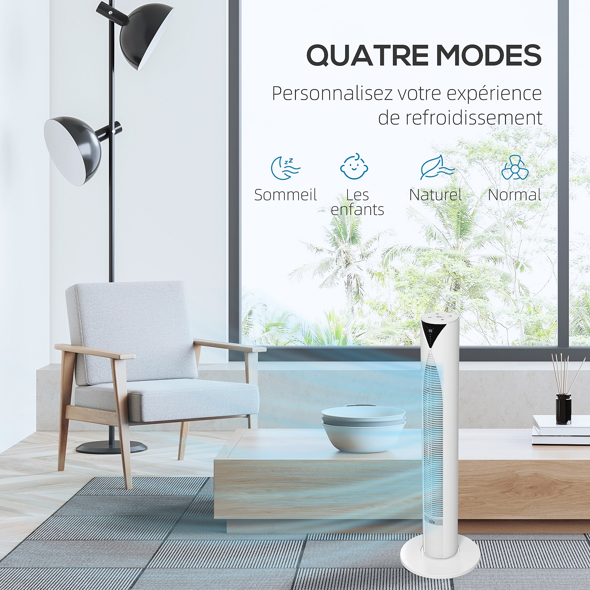 Ventilateur colonne tour oscillant 45 W silencieux télécommande incluse timer 4 modes 3 vitesses filtre blanc