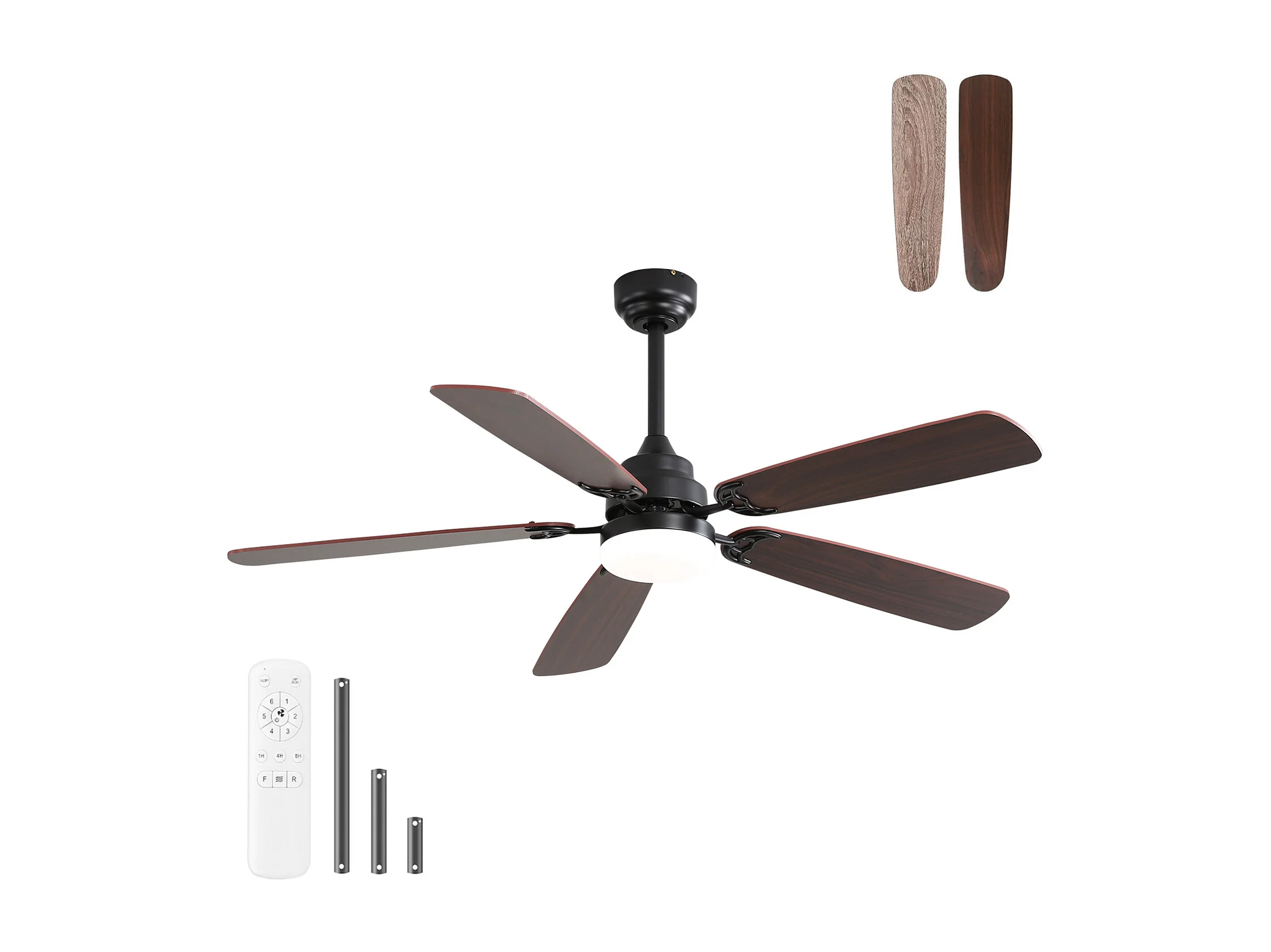 Ventilateur de plafond intérieur avec lumière, 3 pales en bois massif, moteur silencieux et réversible, télécommande, noir (132x132x30 cm)