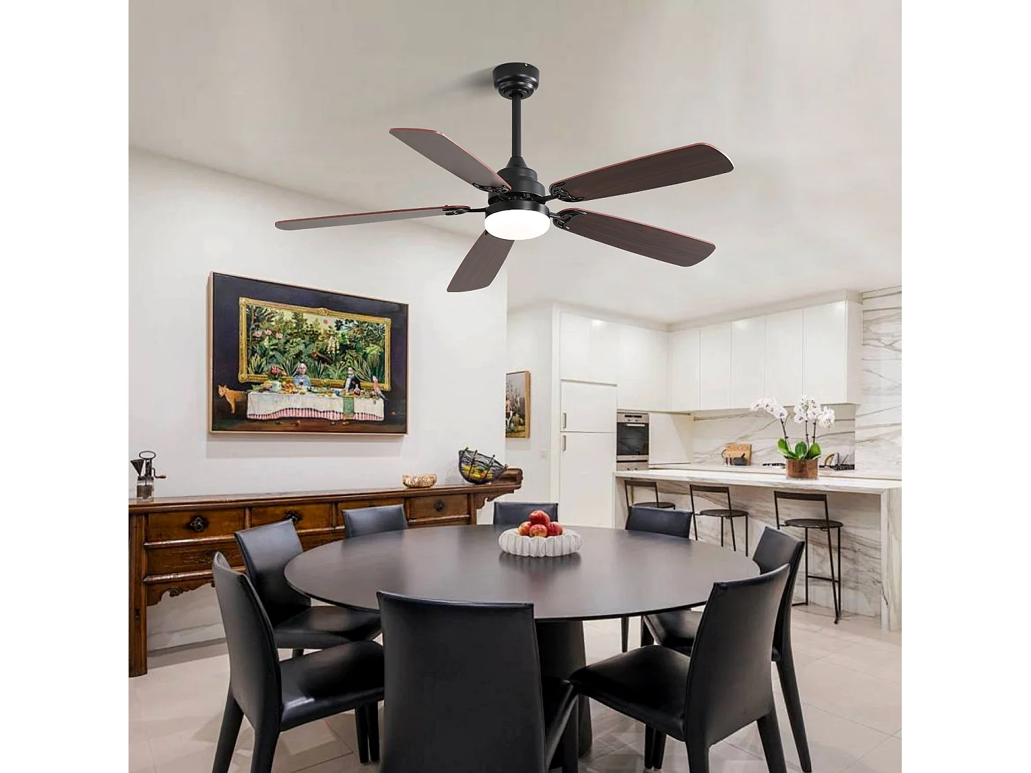 Ventilateur de plafond classique 52 pouces avec éclairage LED dimmable, 5 pales, 6 vitesses et télécommande, moteur DC, MDF, noir (132x132x49 cm)