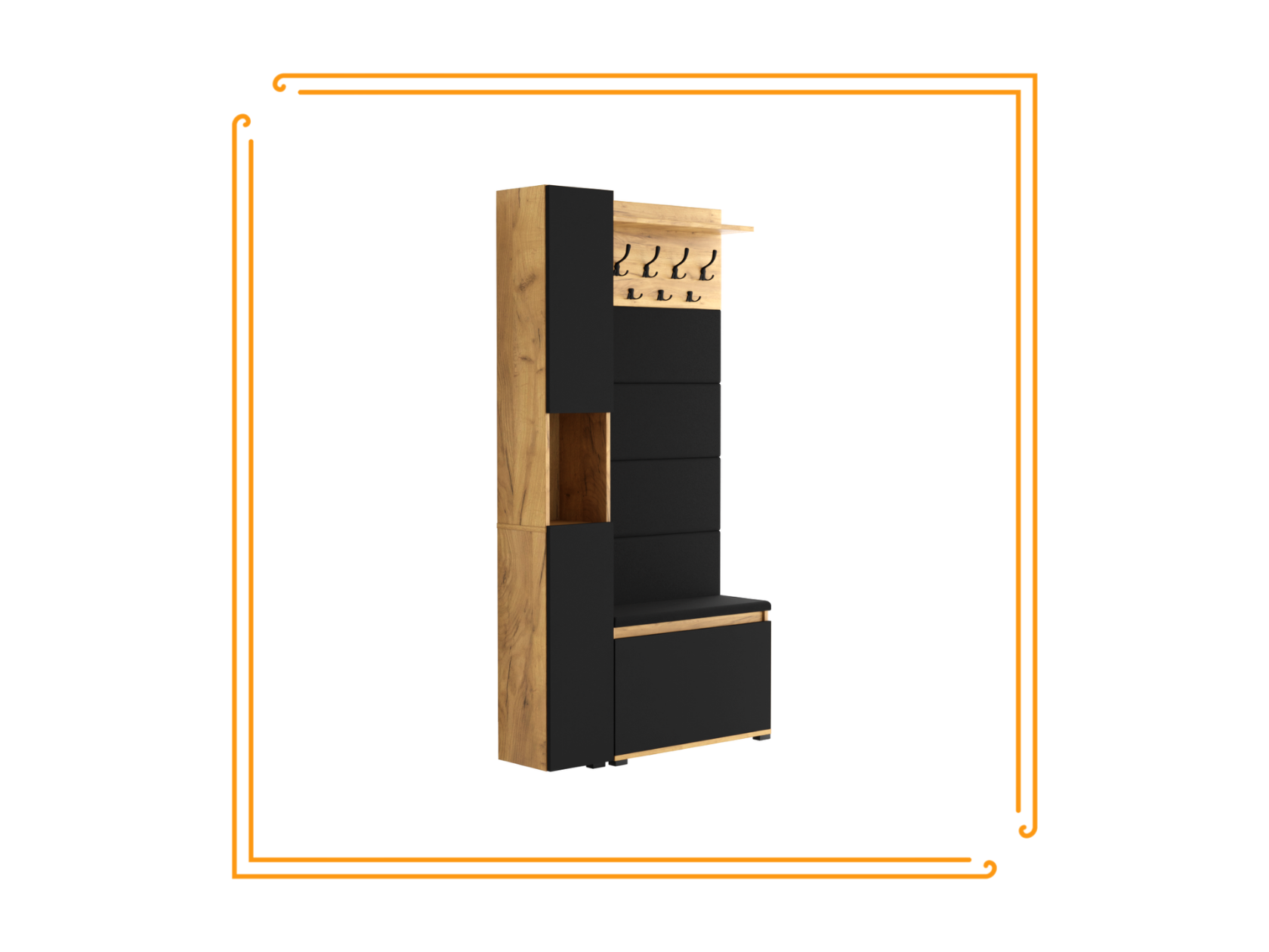 Vestiaire d'entrée avec assise, patère, panneau rembourré – Chêne doré et noir