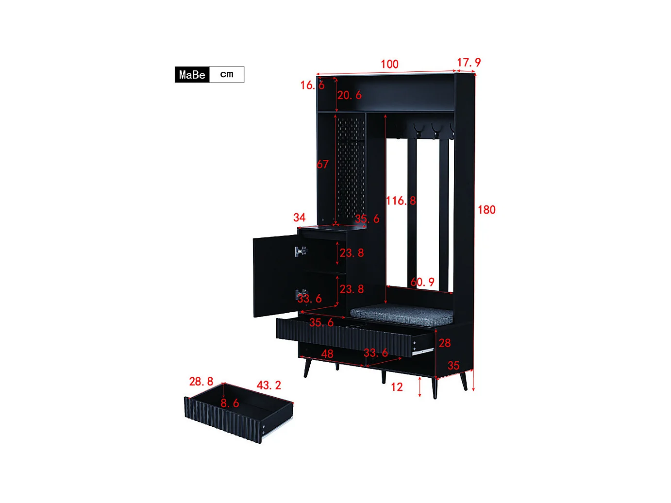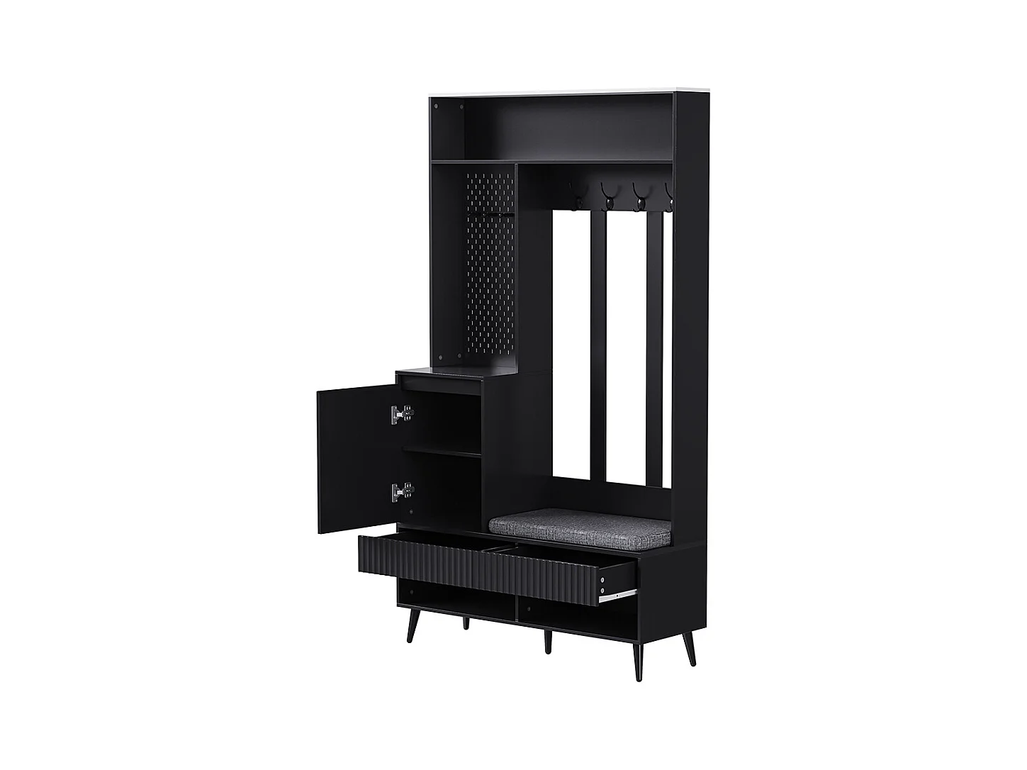 Meuble d'entrée multifonction avec banc, porte-manteaux, étagères, 4 crochets, 2 tiroirs, 1 porte, noir, (100x35x180 cm)