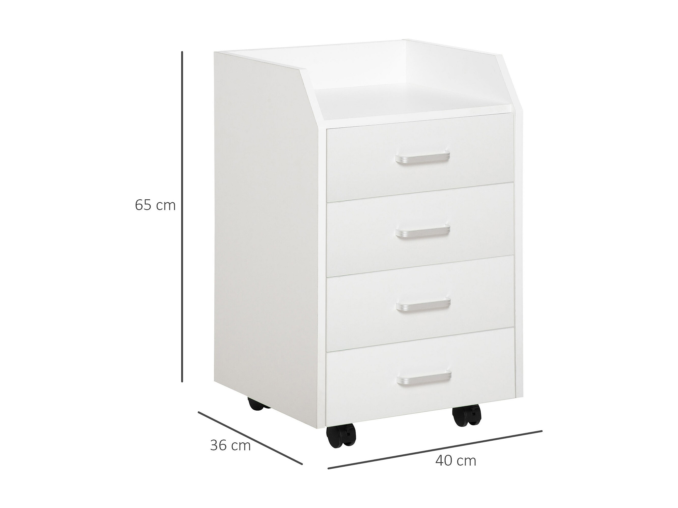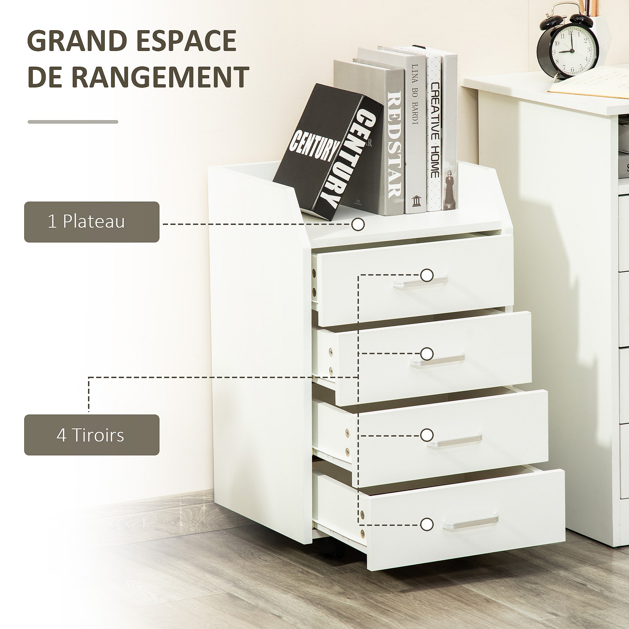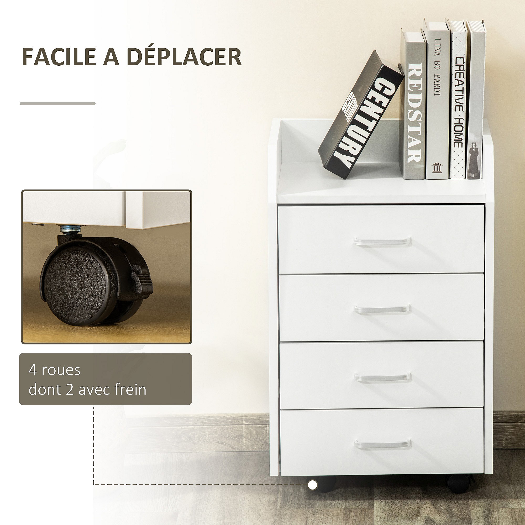 Vinsetto Caisson de bureau rangement bureau sur roulettes 4 tiroirs coulissants plateau à rebord MDF panneaux particules blanc