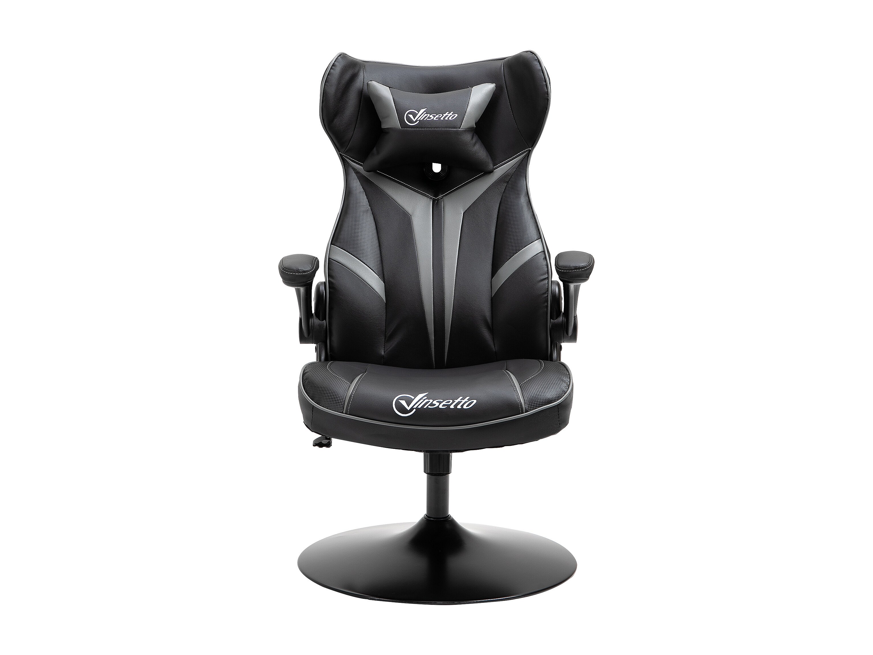 Fauteuil gaming base ronde métal pivotante 360° hauteur réglable tétière accoudoirs relevables PVC gris noir