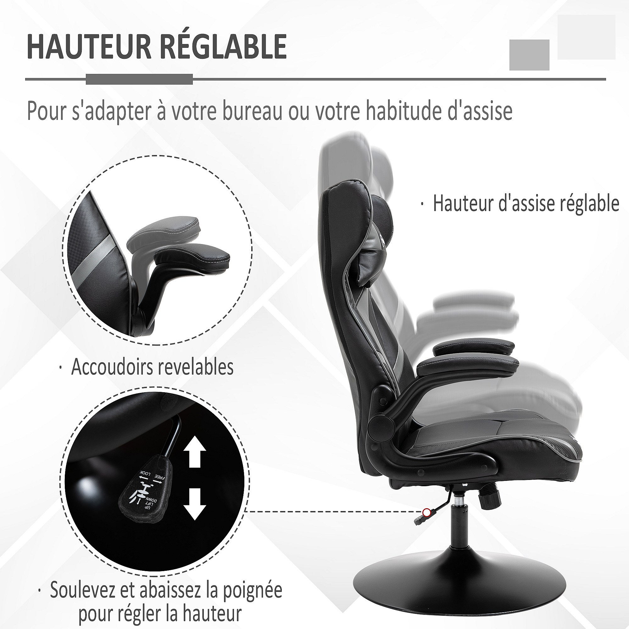 Fauteuil gaming base ronde métal pivotante 360° hauteur réglable tétière coussin lombaires accoudoirs relevables PU tissu gris noir
