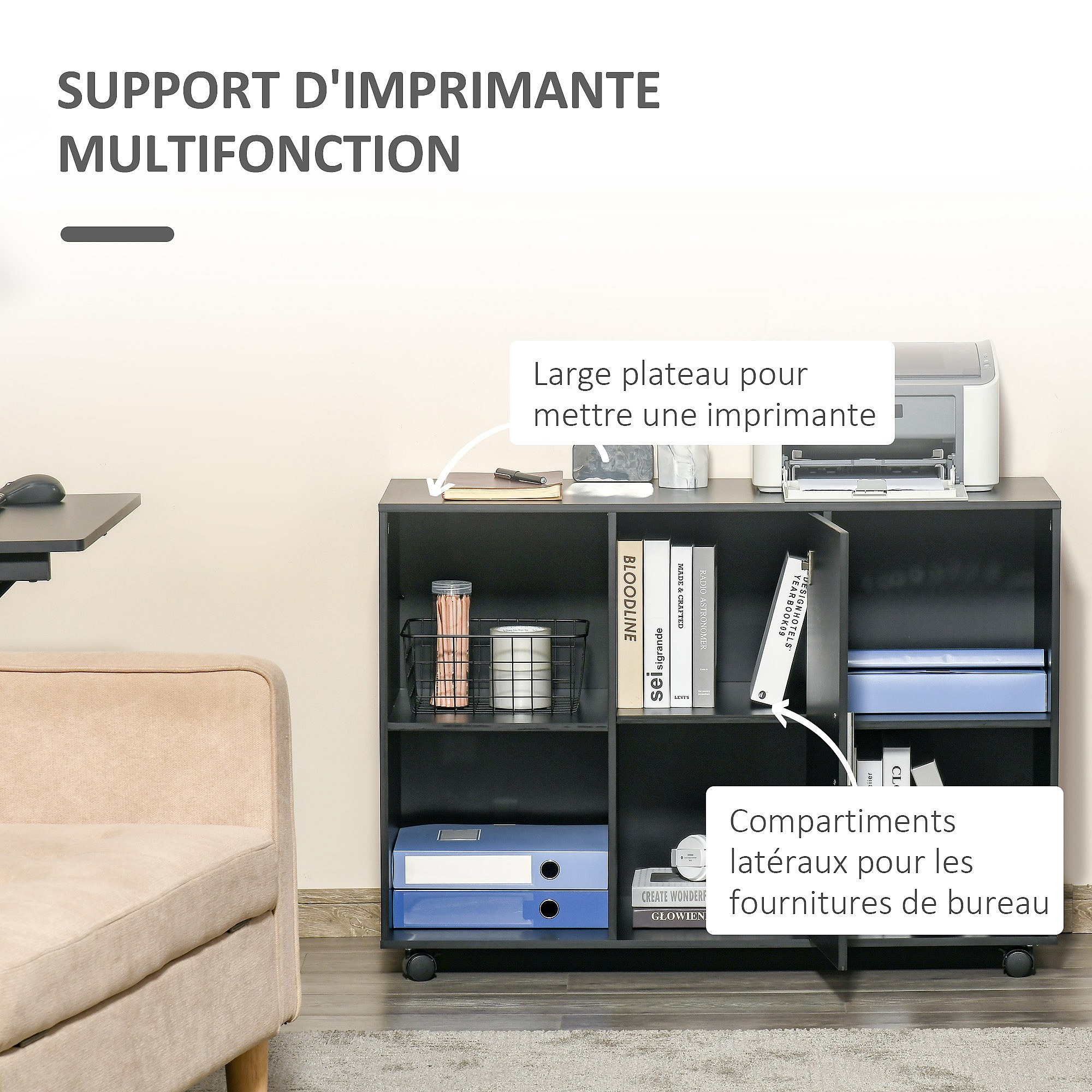 HOMCOM Support d'imprimante organiseur bureau caisson placard porte 3 niches + grand plateau panneaux particules noir