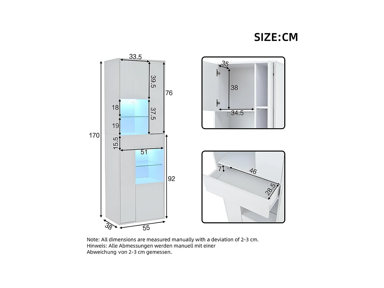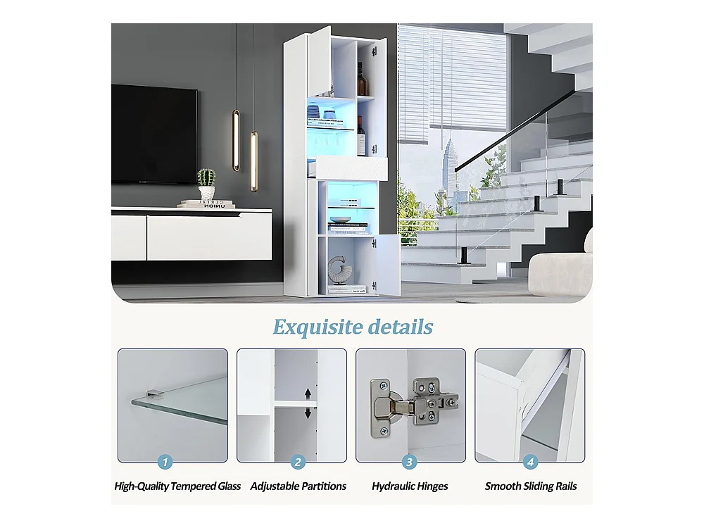 Vitrine moderne blanc avec LED 16 couleurs et bluetooth avec façade en verre et tiroir espace de rangement et éclairage MDF et verre de sécurité