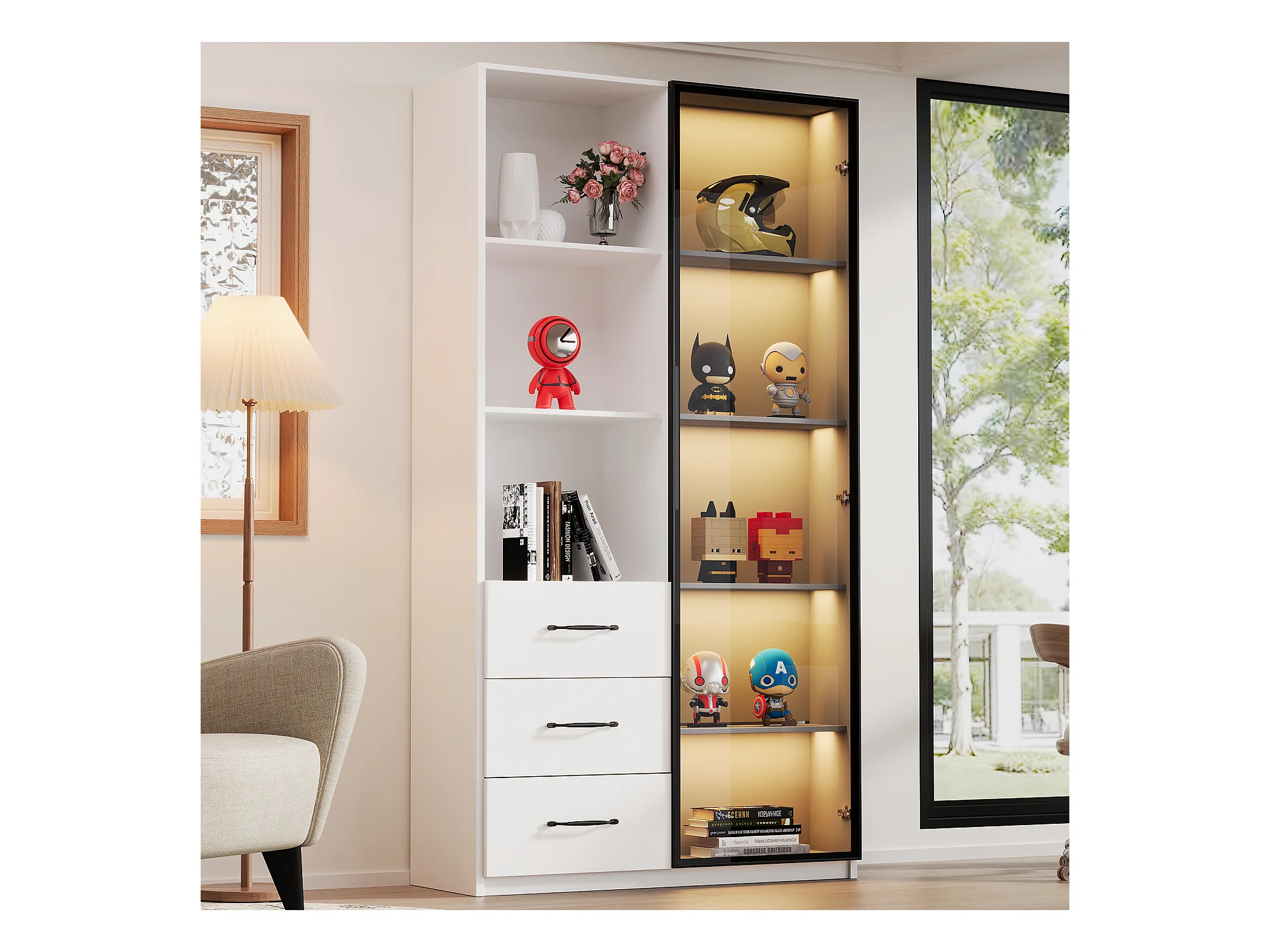 Vitrine buffet - 80 x 40 x 160 cm - avec porte en verre trempé + Leds + 3 tiroirs - agglomméré - blanc