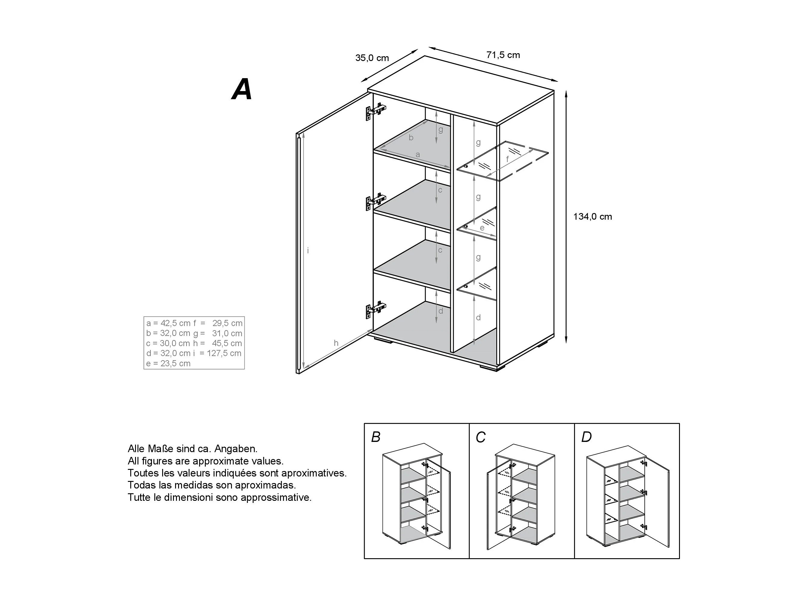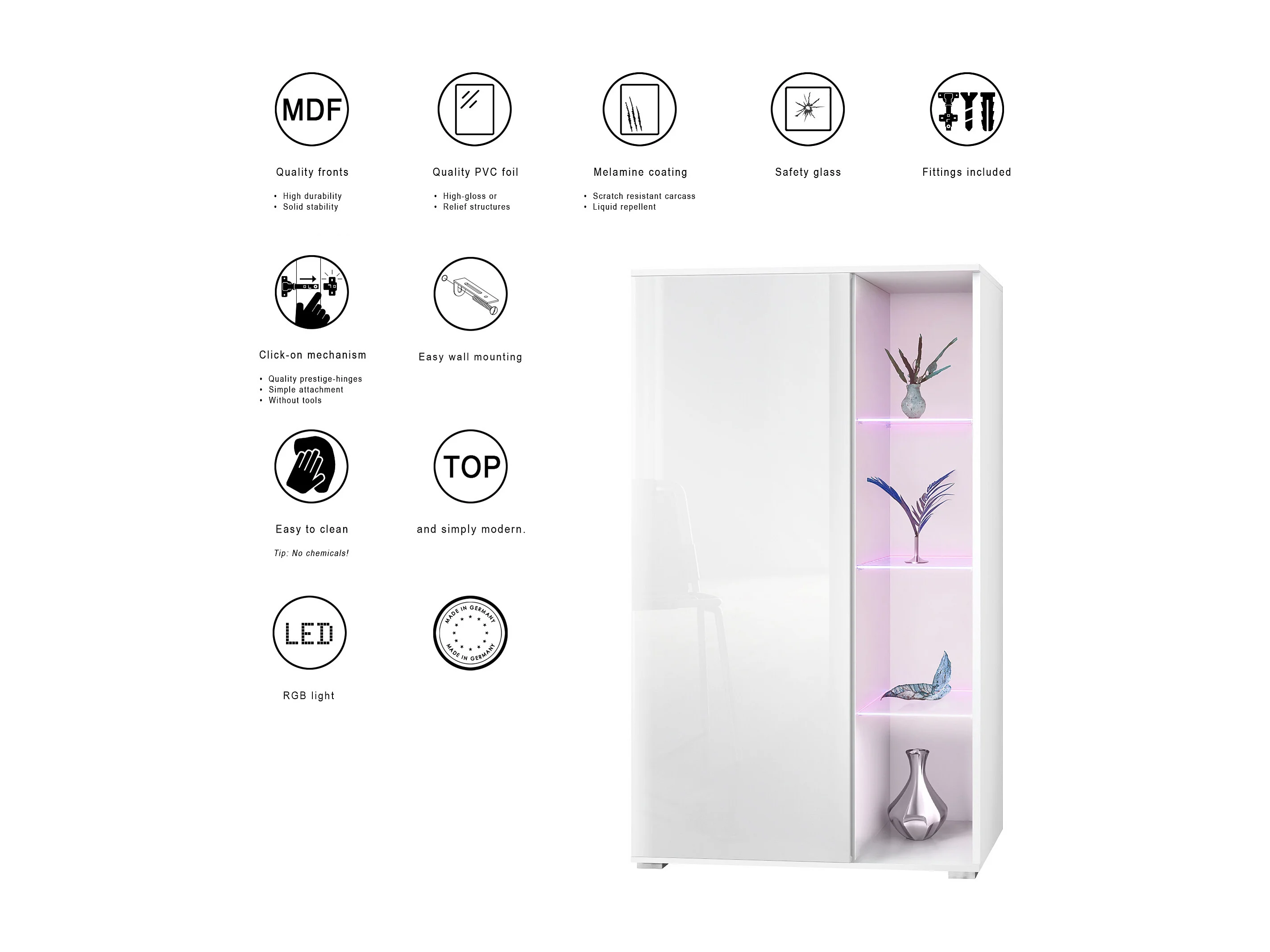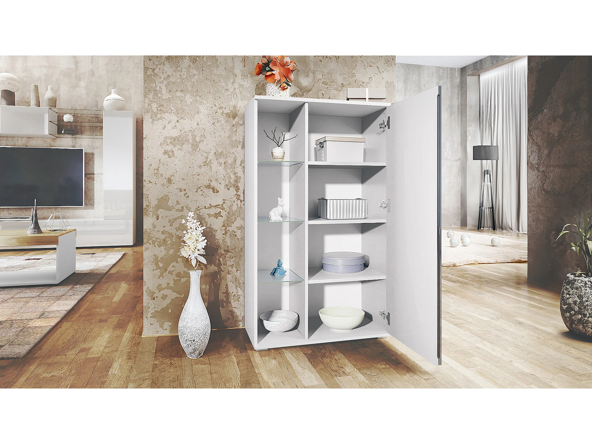 Vitrine Davos, vitrine sur pied avec 3 étagères en verre et 8 compartiments y compris LED, blanc mat/aspect béton oxyde (71,5 x 134 x 35 cm)