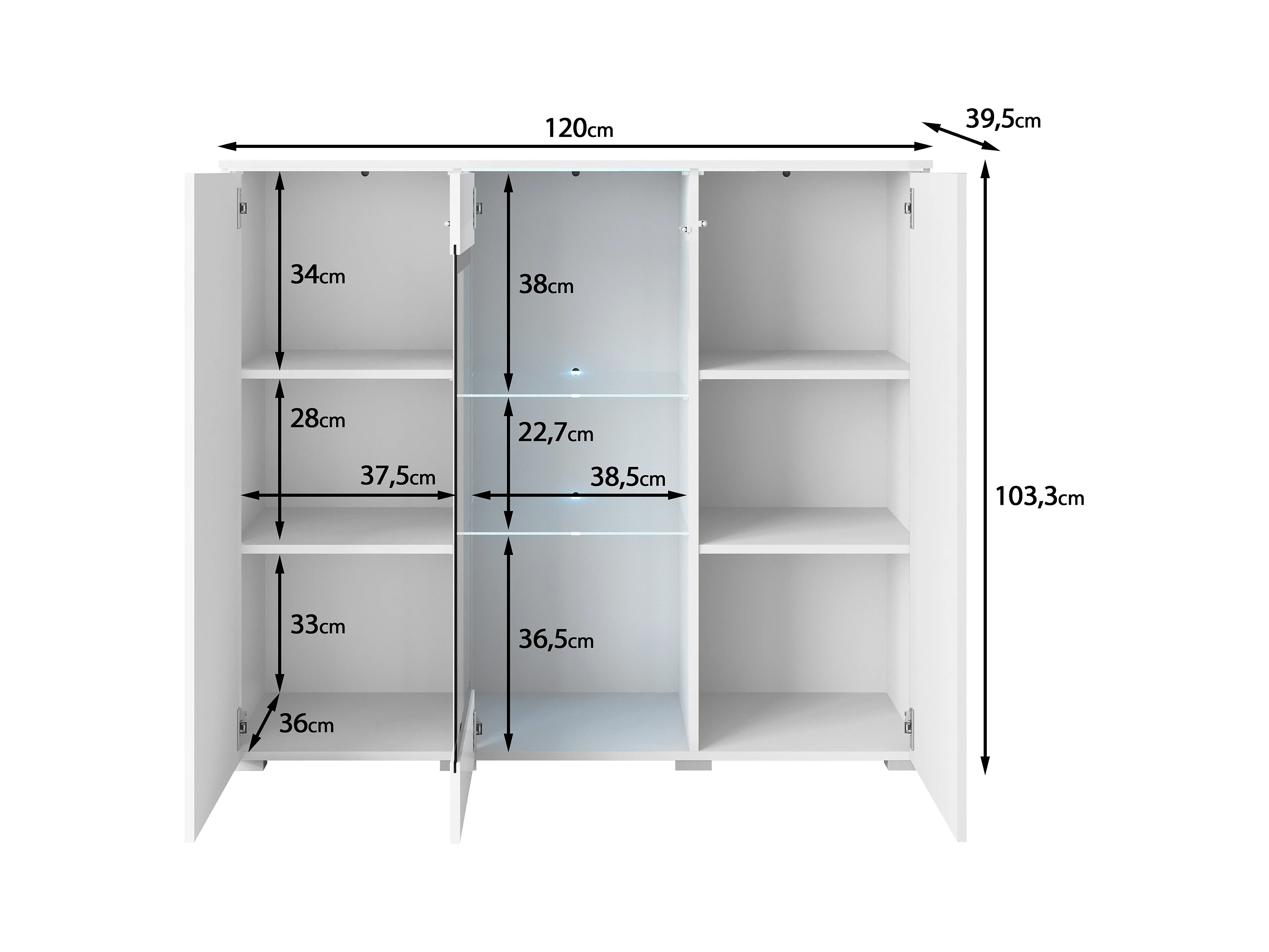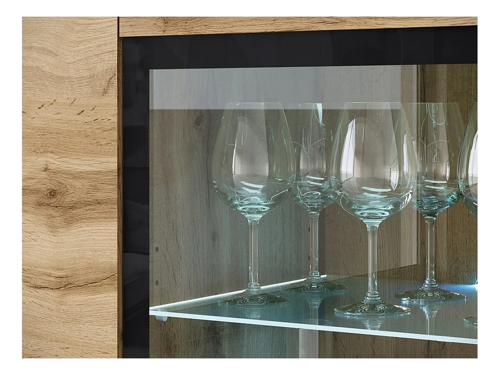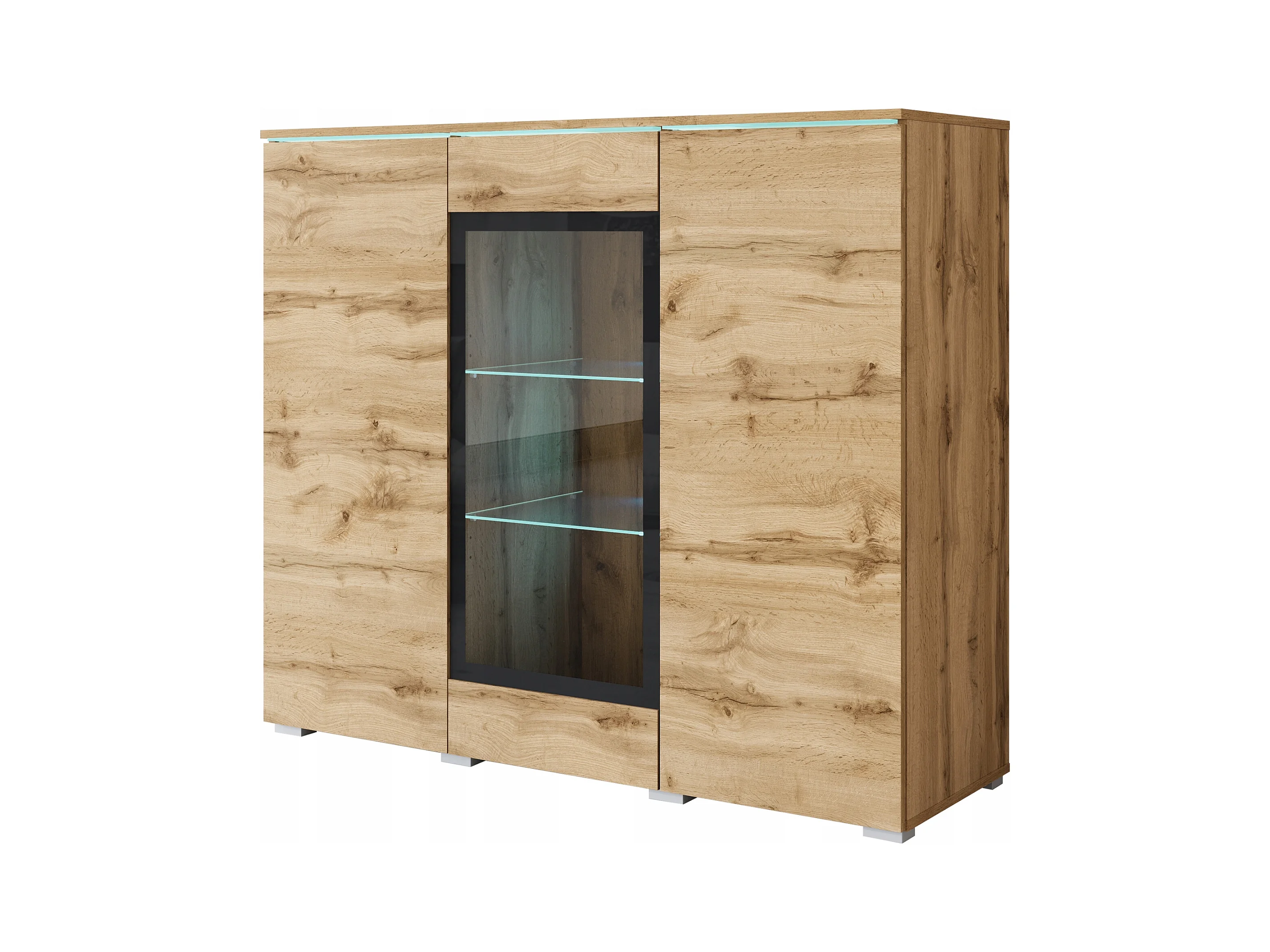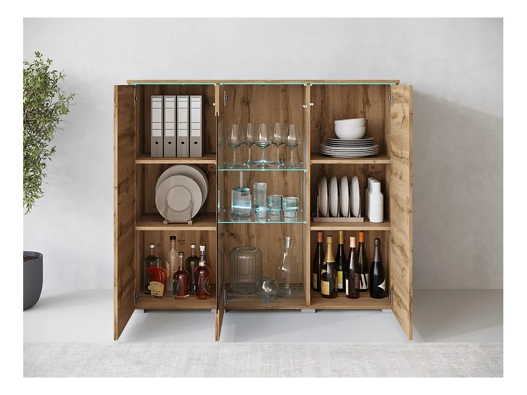 Vitrine haute moderne 120 cm pour salon avec LED, 3 portes, chêne wotan