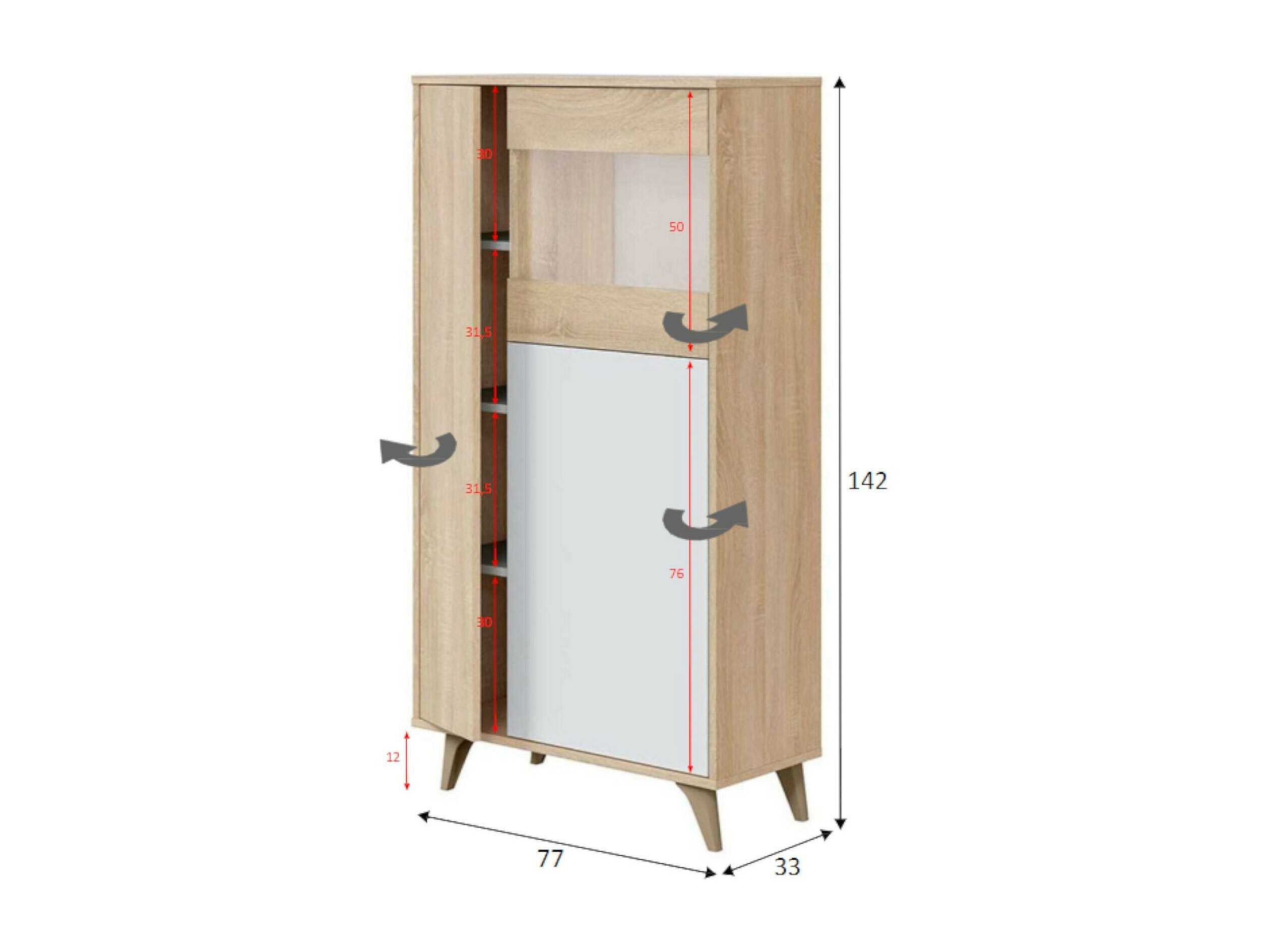 Vitrine Atlanta, Vitrine moderne avec 3 portes, Buffet pour salon ou salon, Buffet haut avec étagères, 77x33h142 cm, Chêne et Blanc