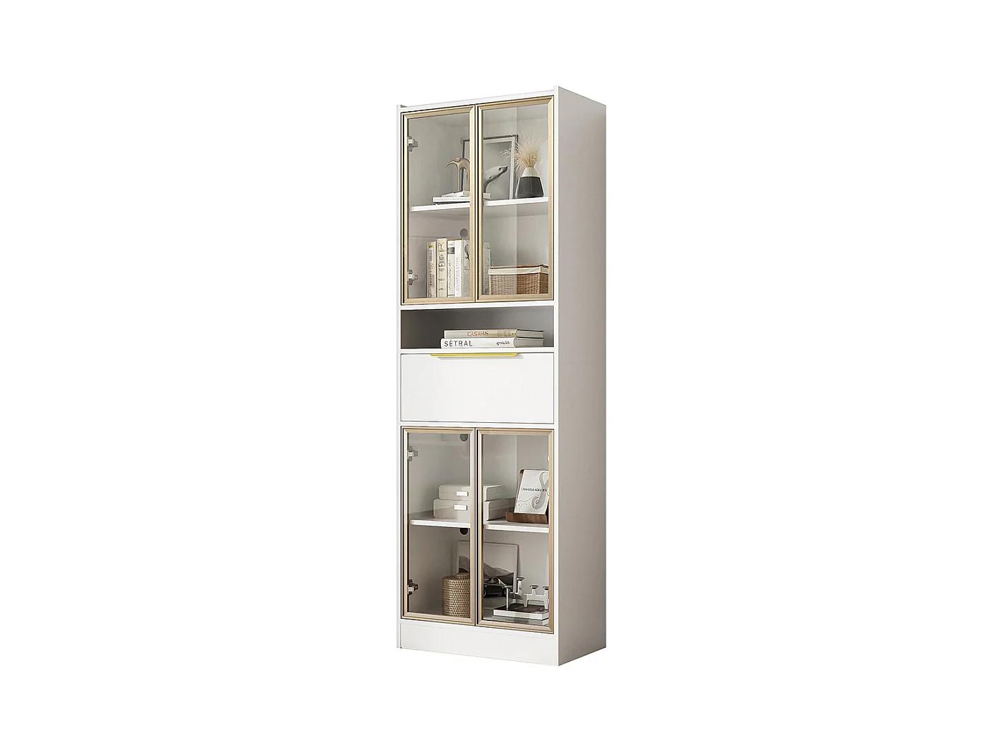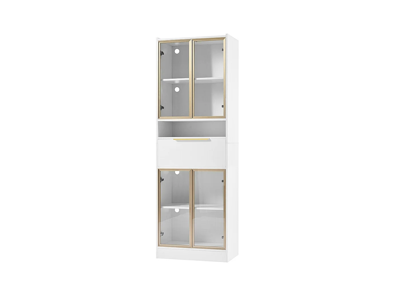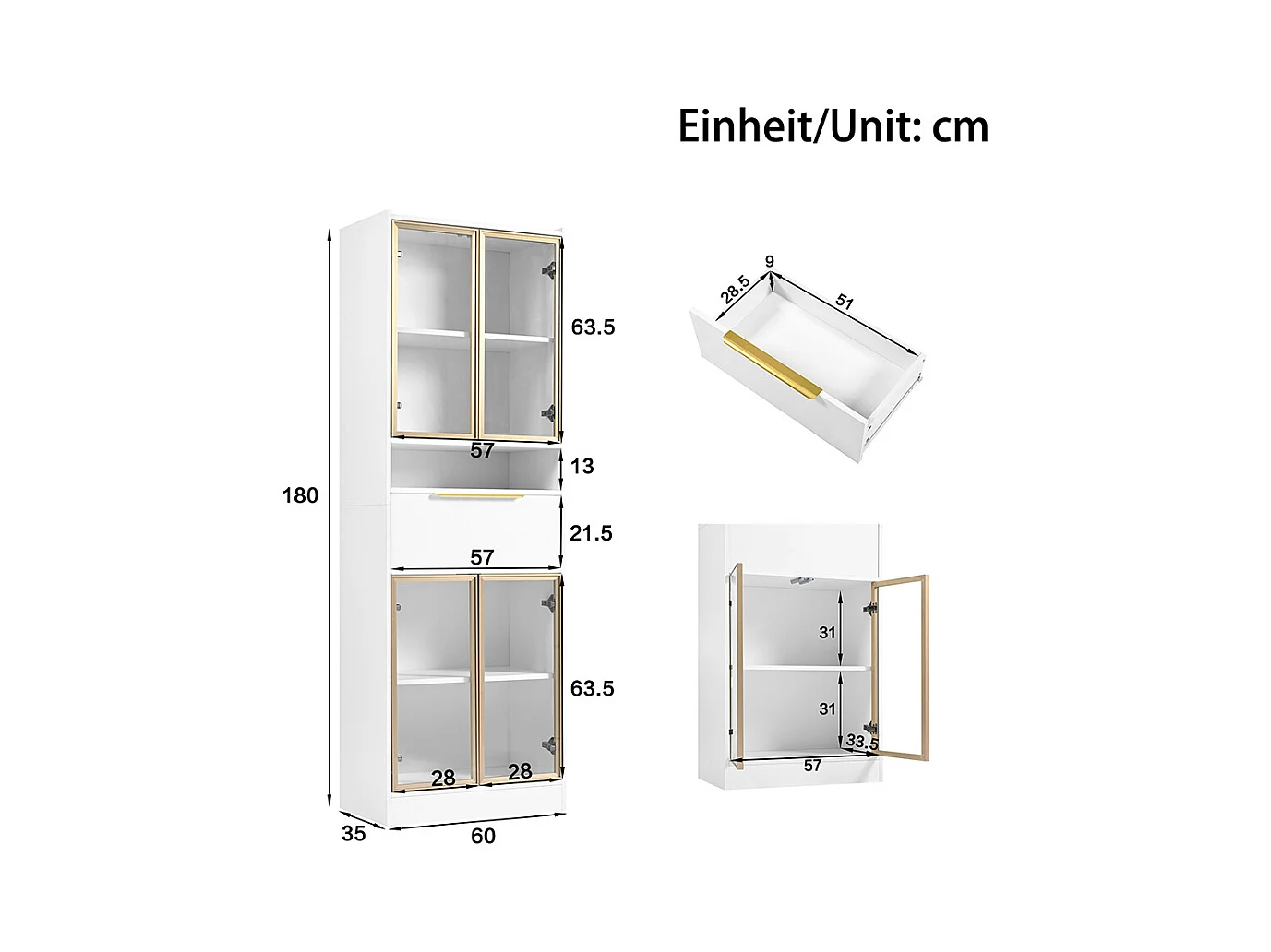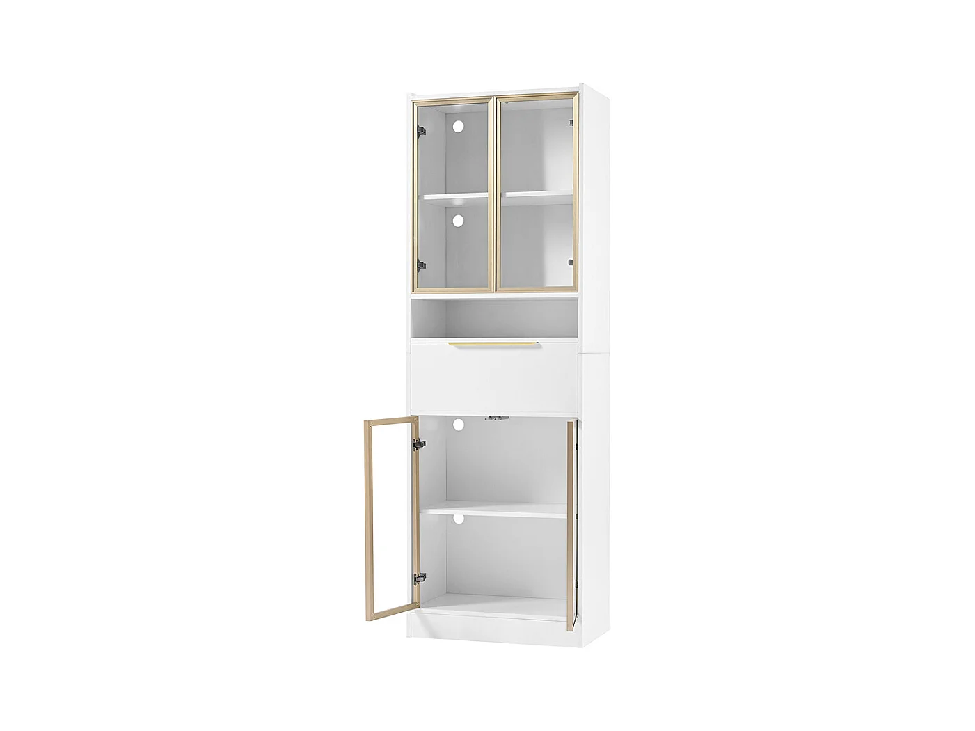 Vitrine 60x35x180cm avec 4 portes en verre trempé, 1 tiroir et 1 niche, LED inclus, corps en blanc laqué