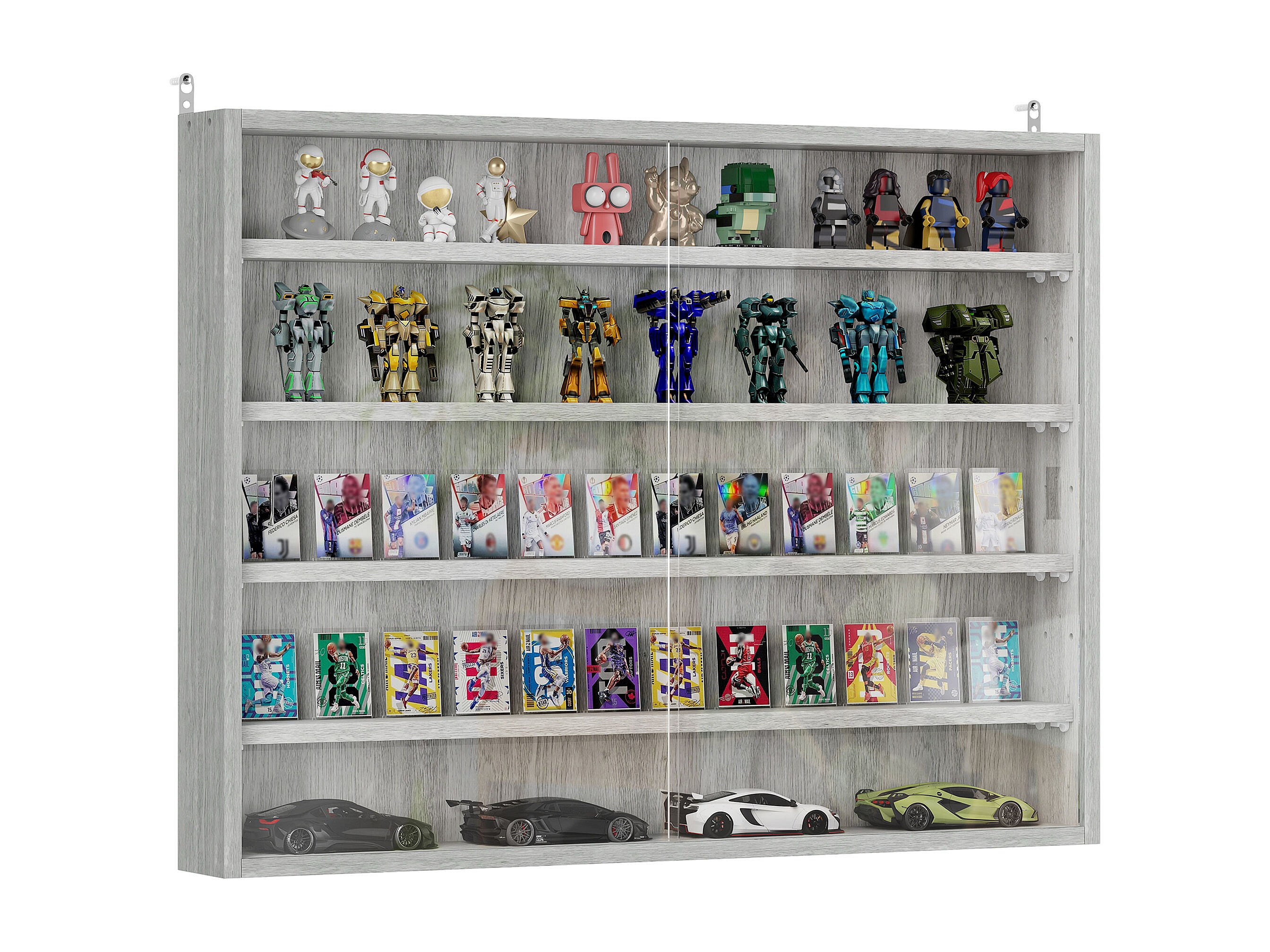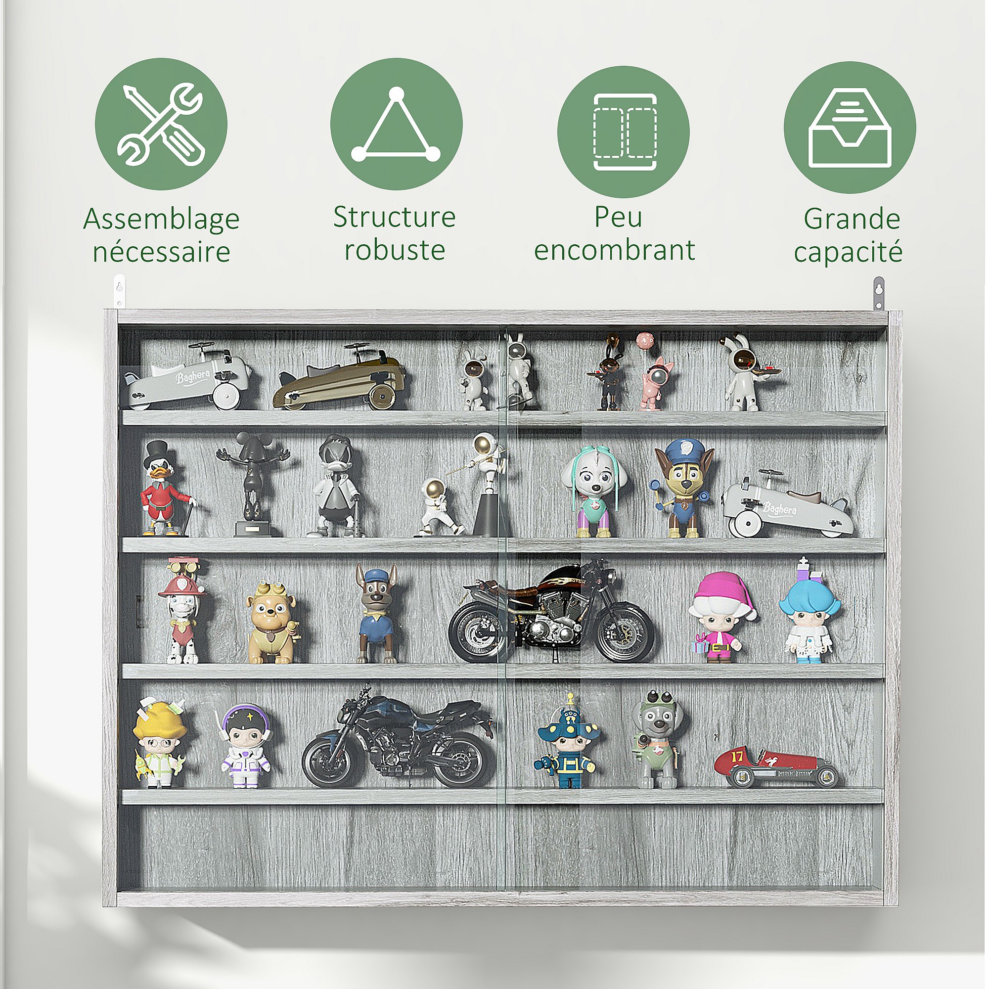 Vitrine murale étagère - 5 étagères réglables - 2 portes coulissantes verre - panneaux gris