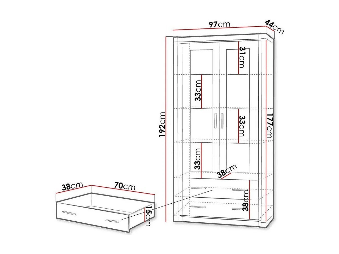Étagère Lorelie 116, Avec des portes|Fermé|Avec tiroirs, Verre trempé|Stratifié, 192x97cm
